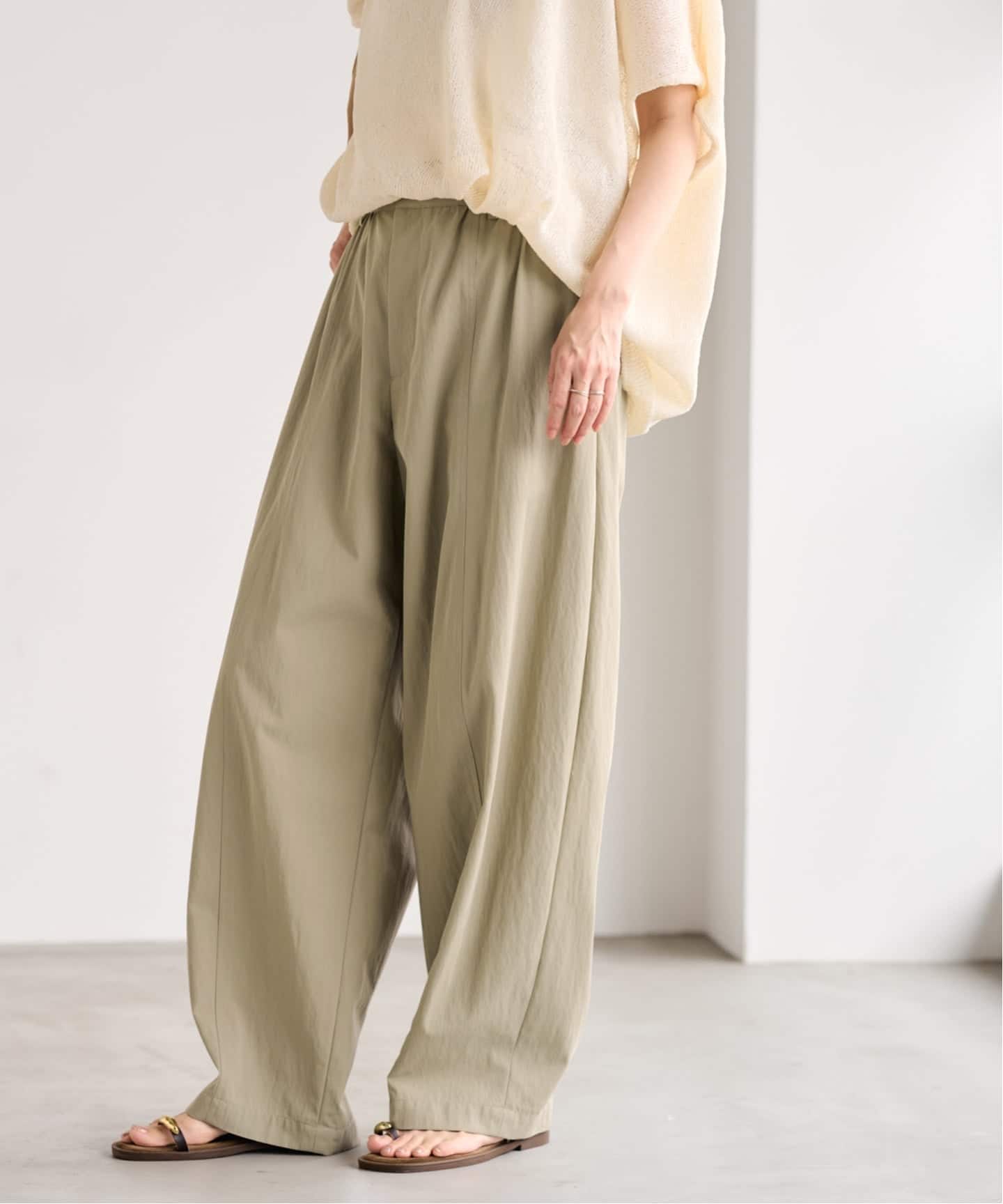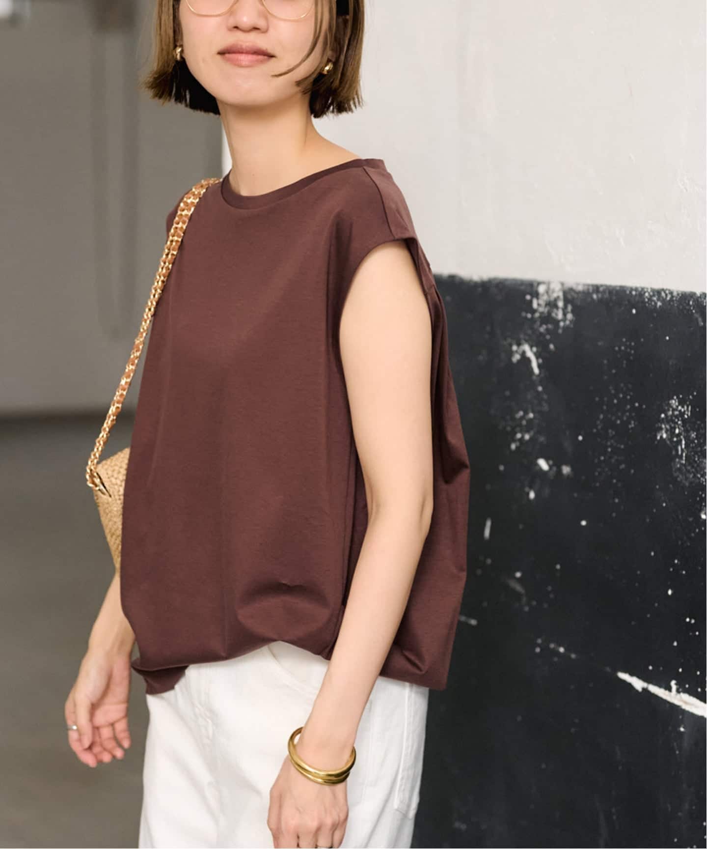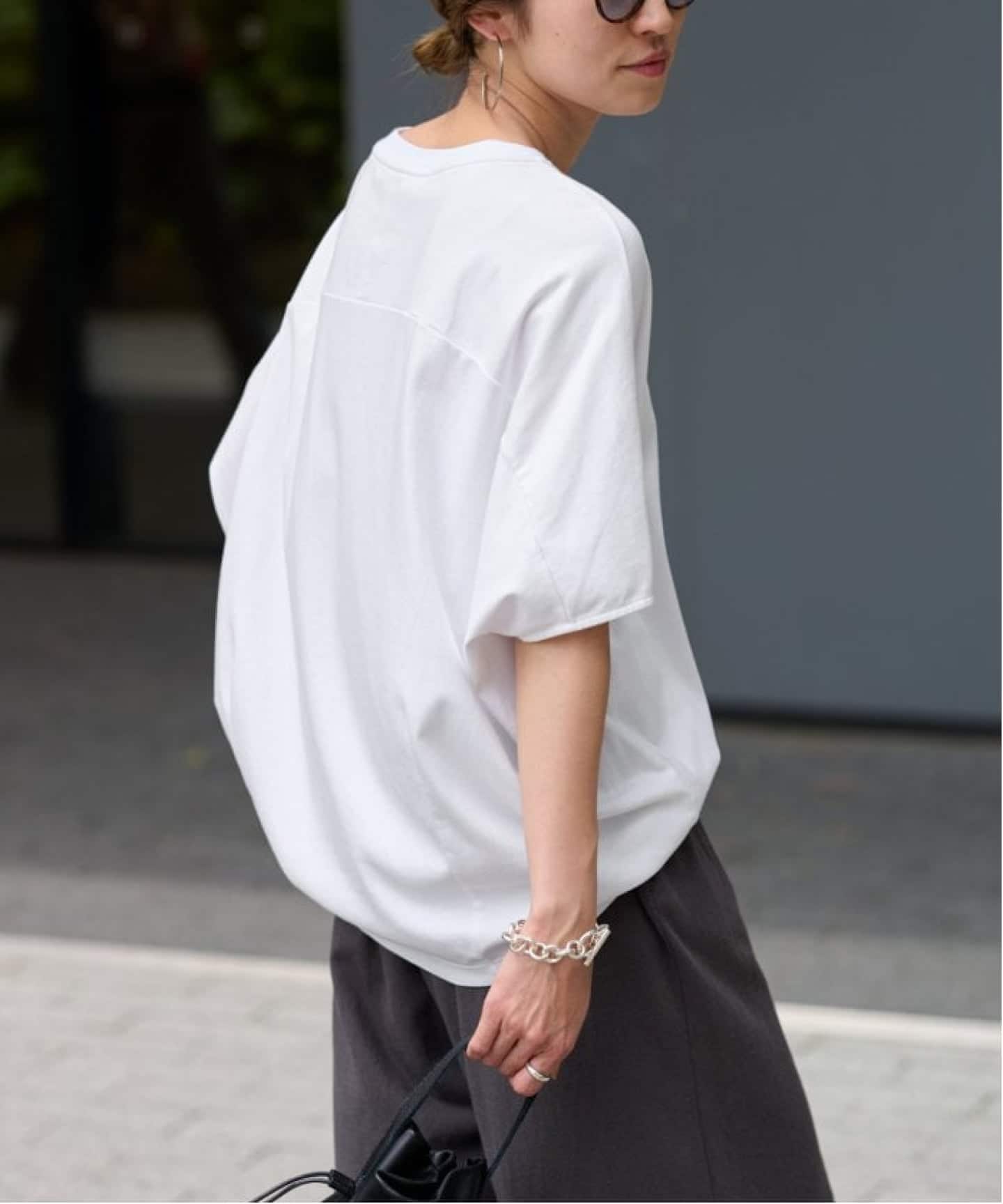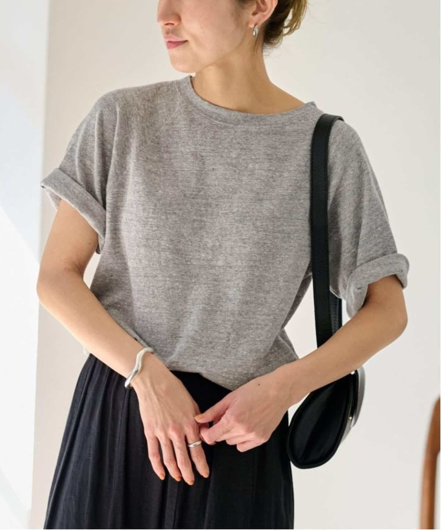 動くたびに表情が出る異素材コンビが、シンプルながらも奥行きのある印象をつくります。