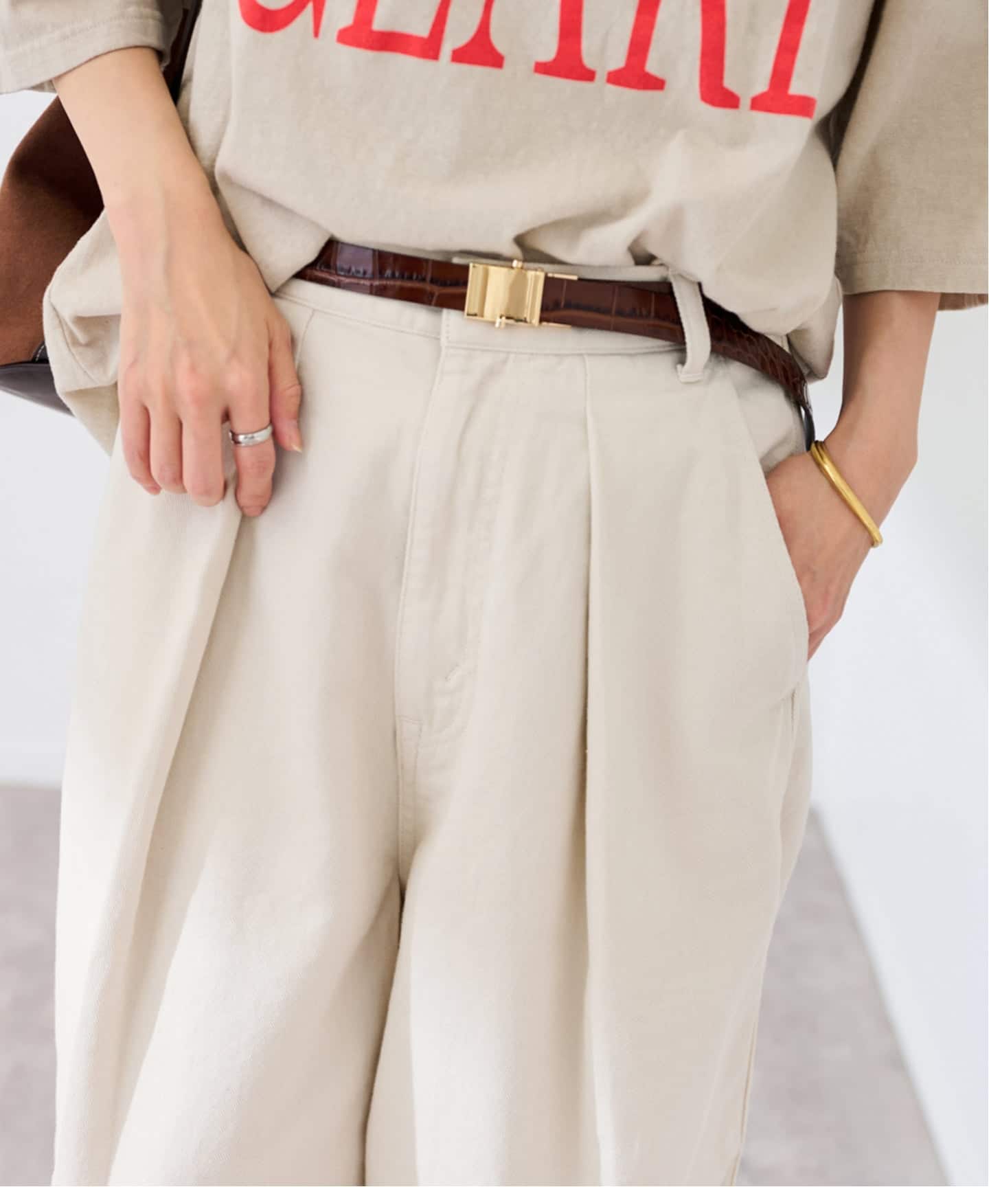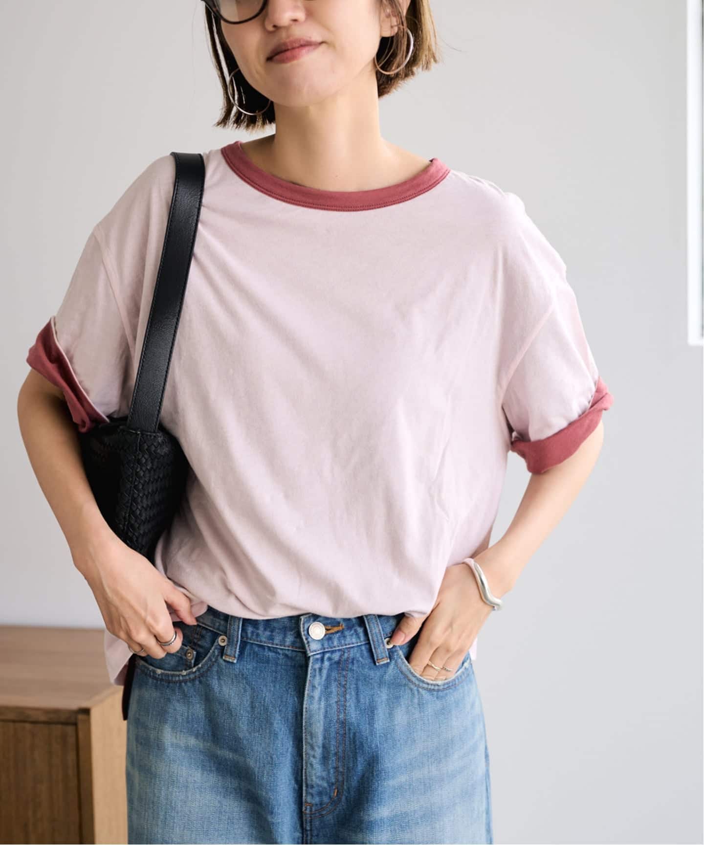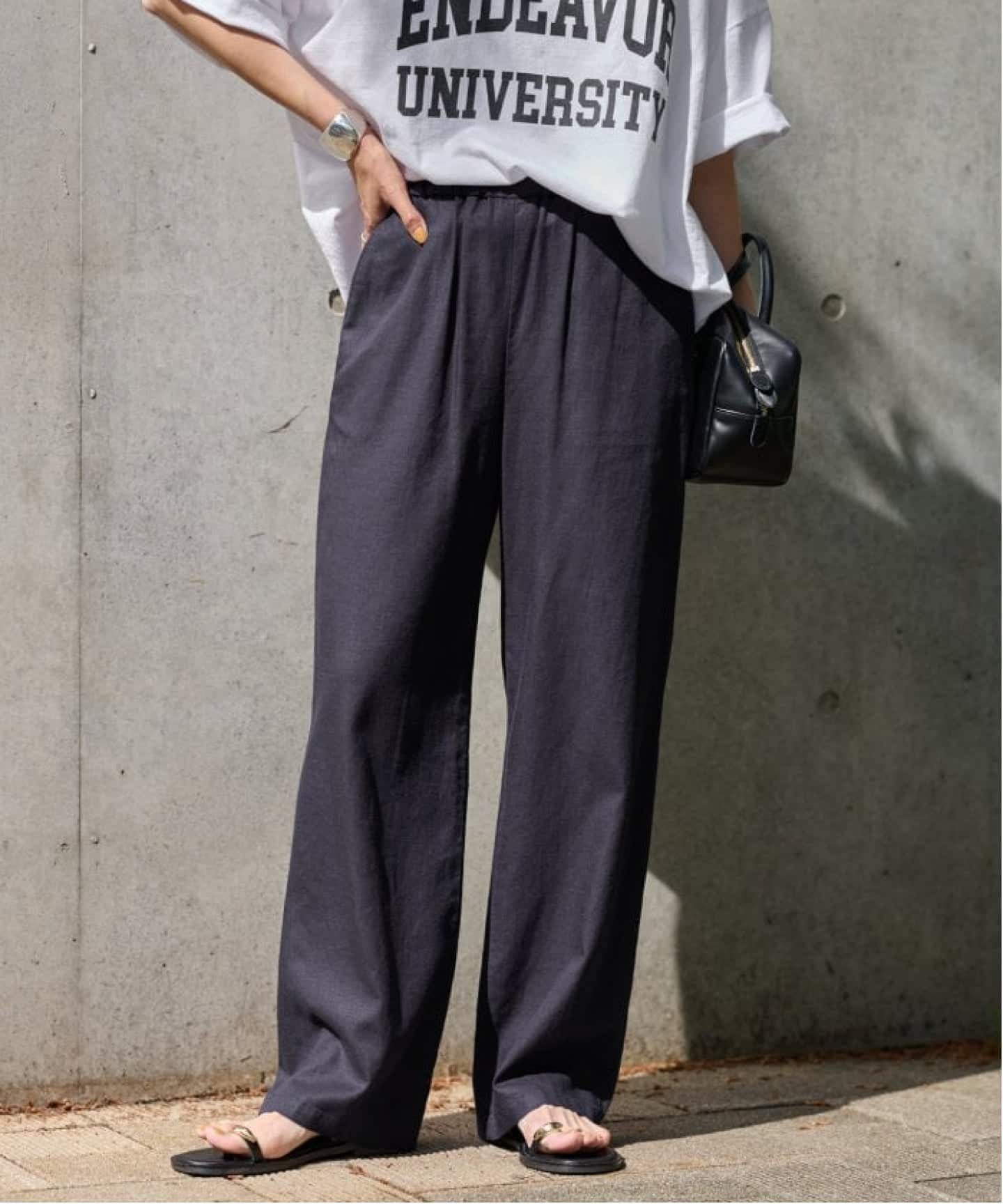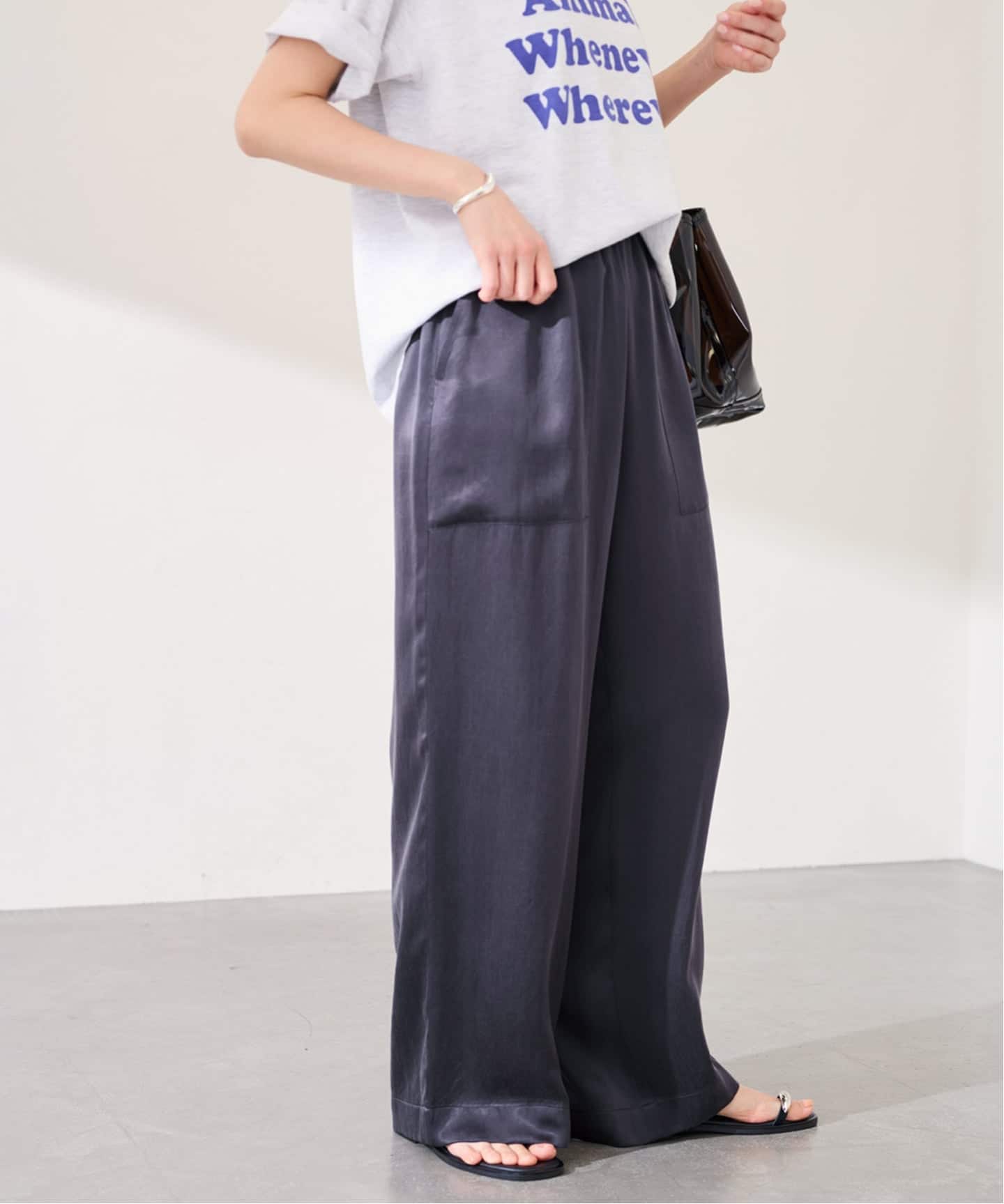 動くたびに表情が出る異素材コンビが、シンプルながらも奥行きのある印象をつくります。