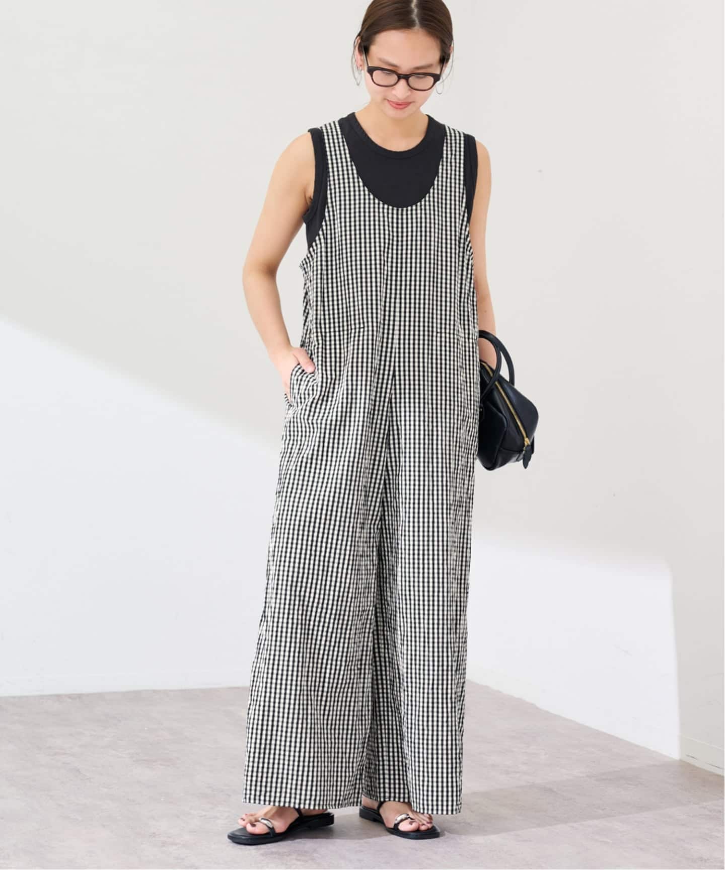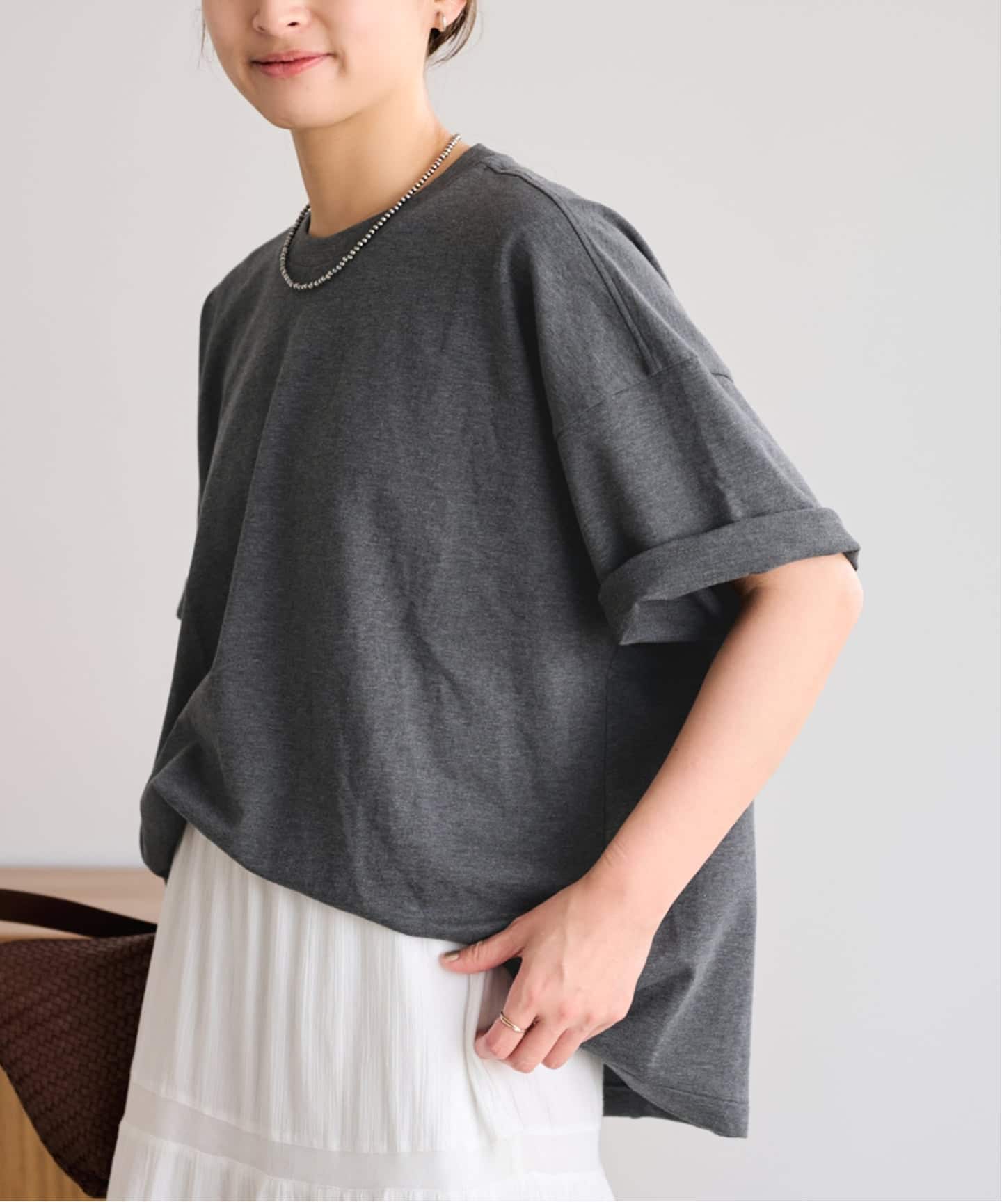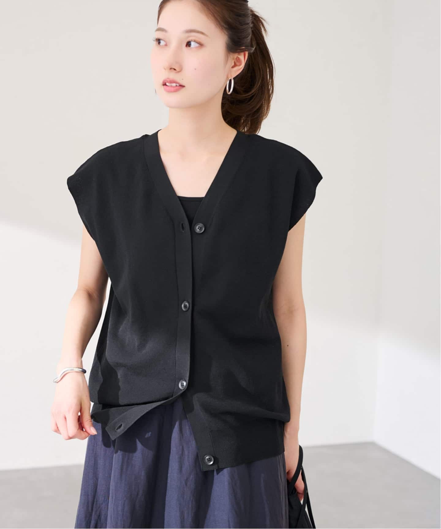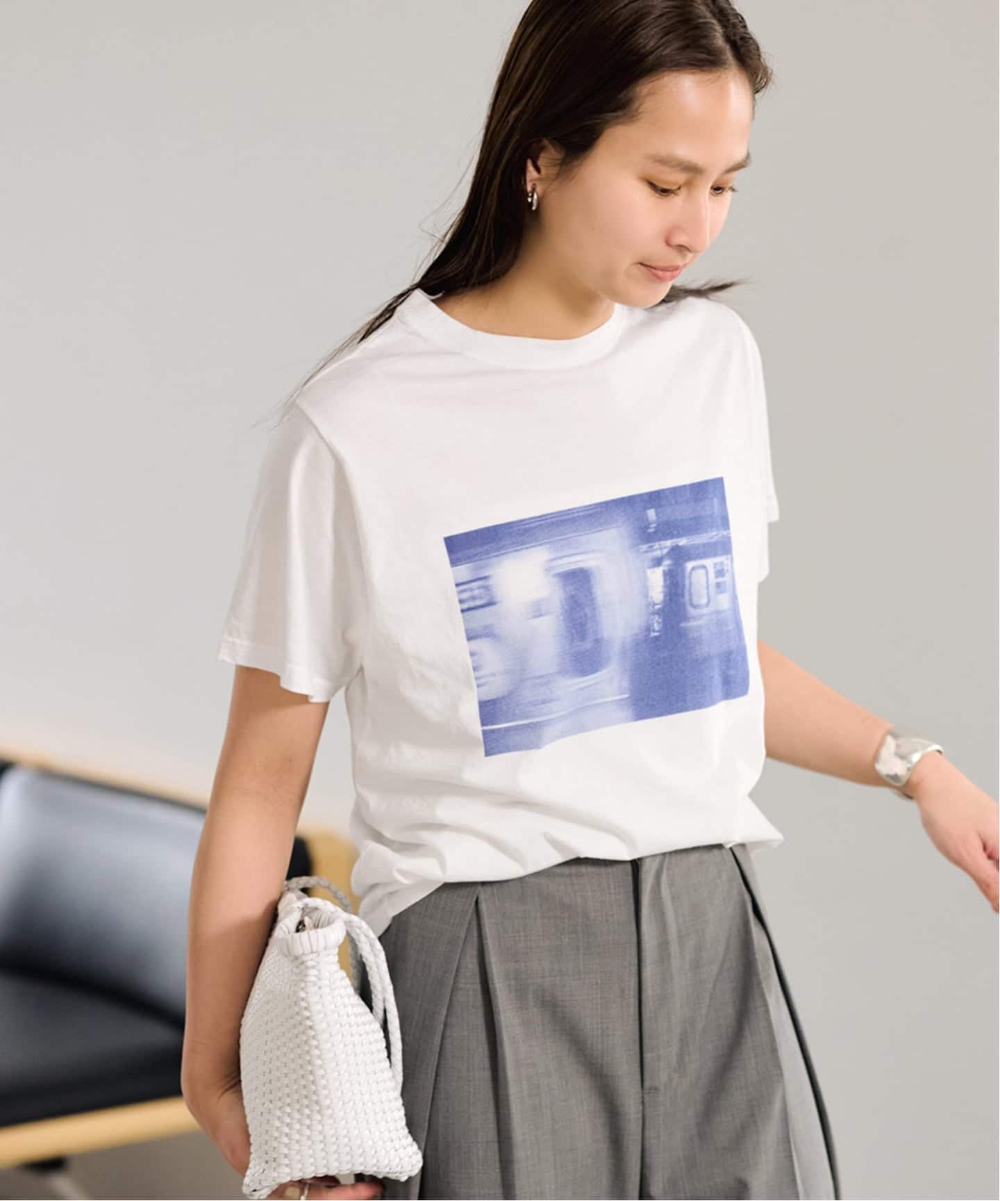 動くたびに表情が出る異素材コンビが、シンプルながらも奥行きのある印象をつくります。