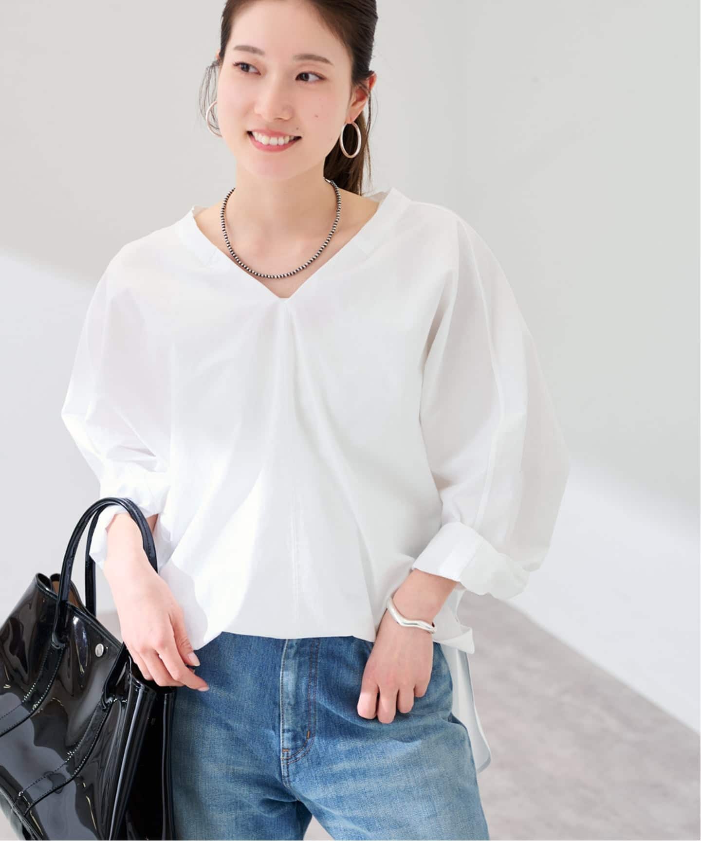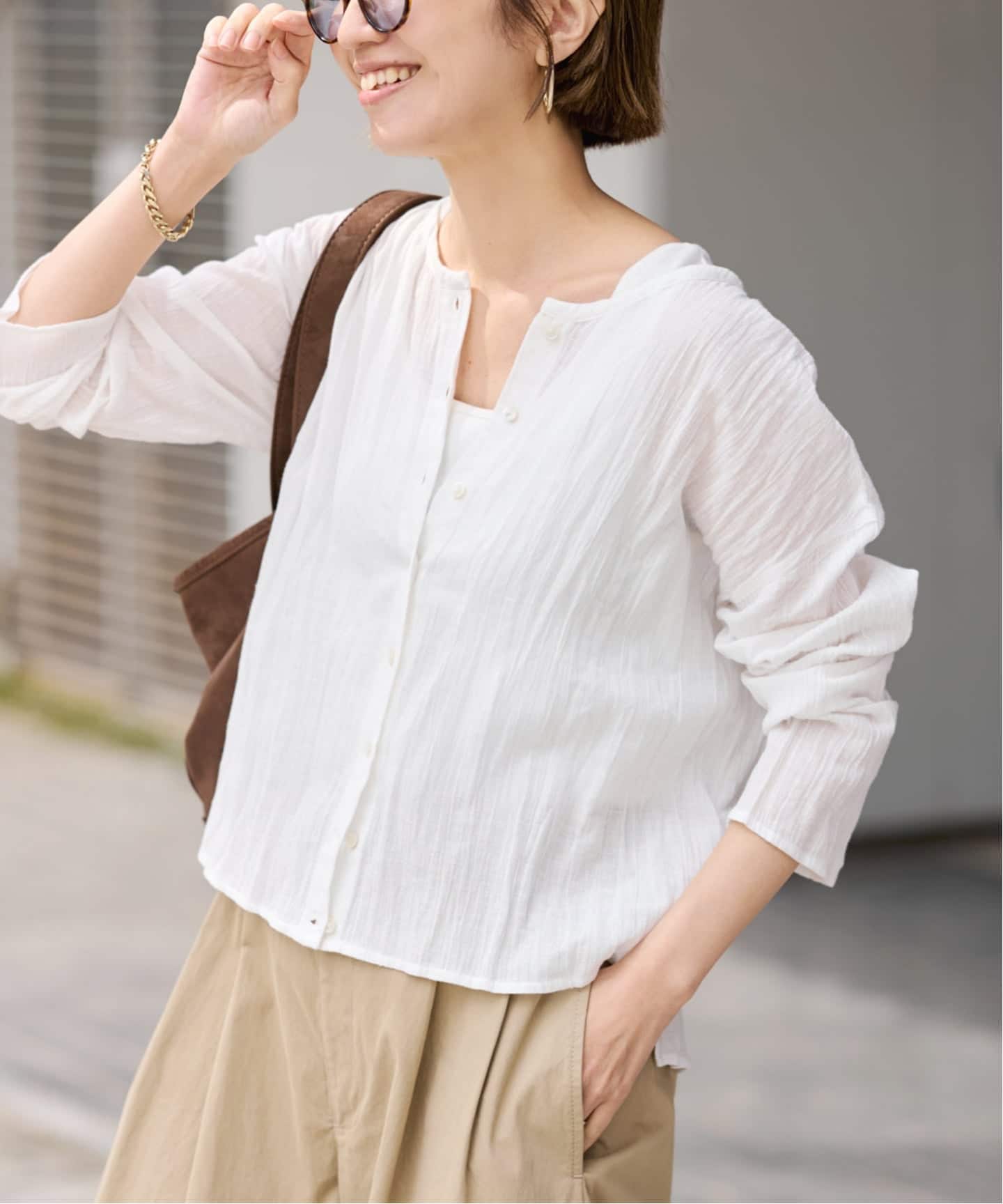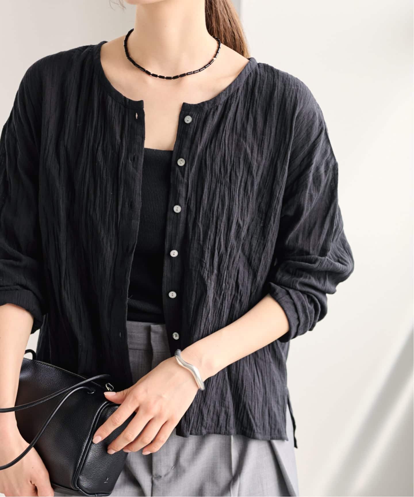やや短めの丈感で、ブラウスとしてもライトな羽織りとしても使える便利なデザインです。