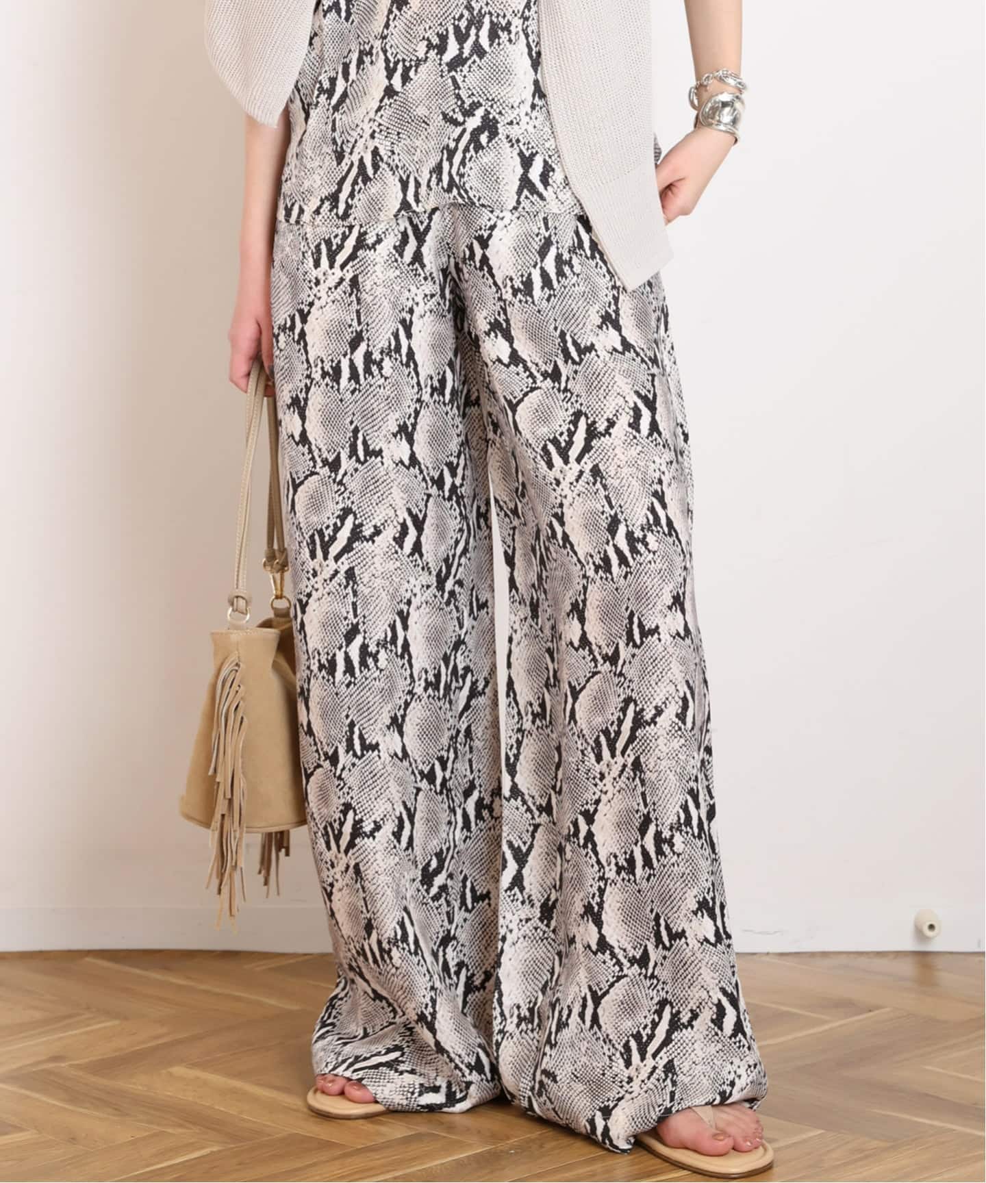 モノトーンのシックなパイソン柄がインパクトのある、キャミソールとパンツのセットアップ。