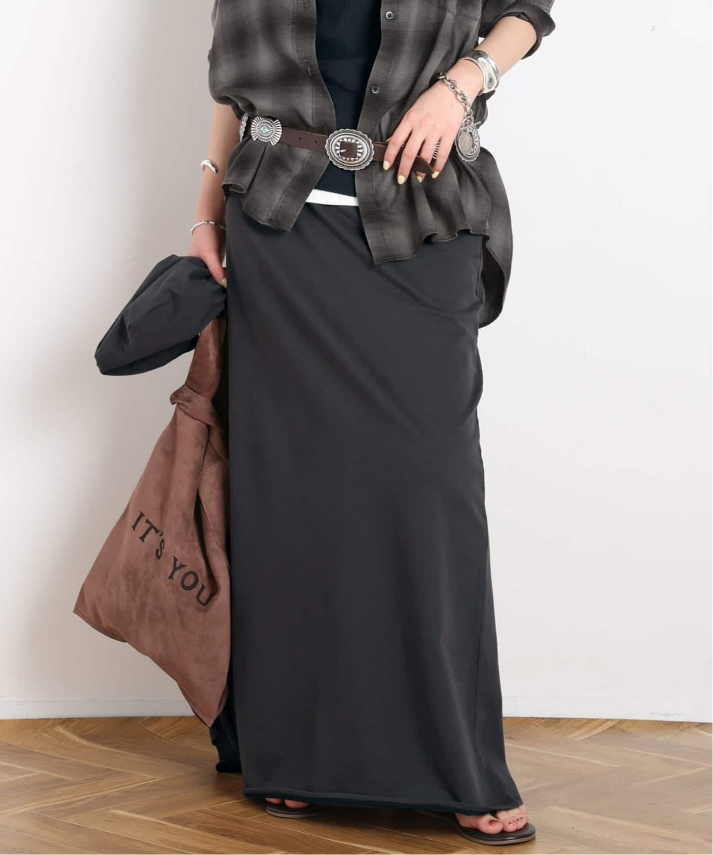 パンツはリラックスしたワイドシルエットと、縦ラインを協調したストレートなラインがリラックス感がありながら脚を綺麗に見せてくれる。