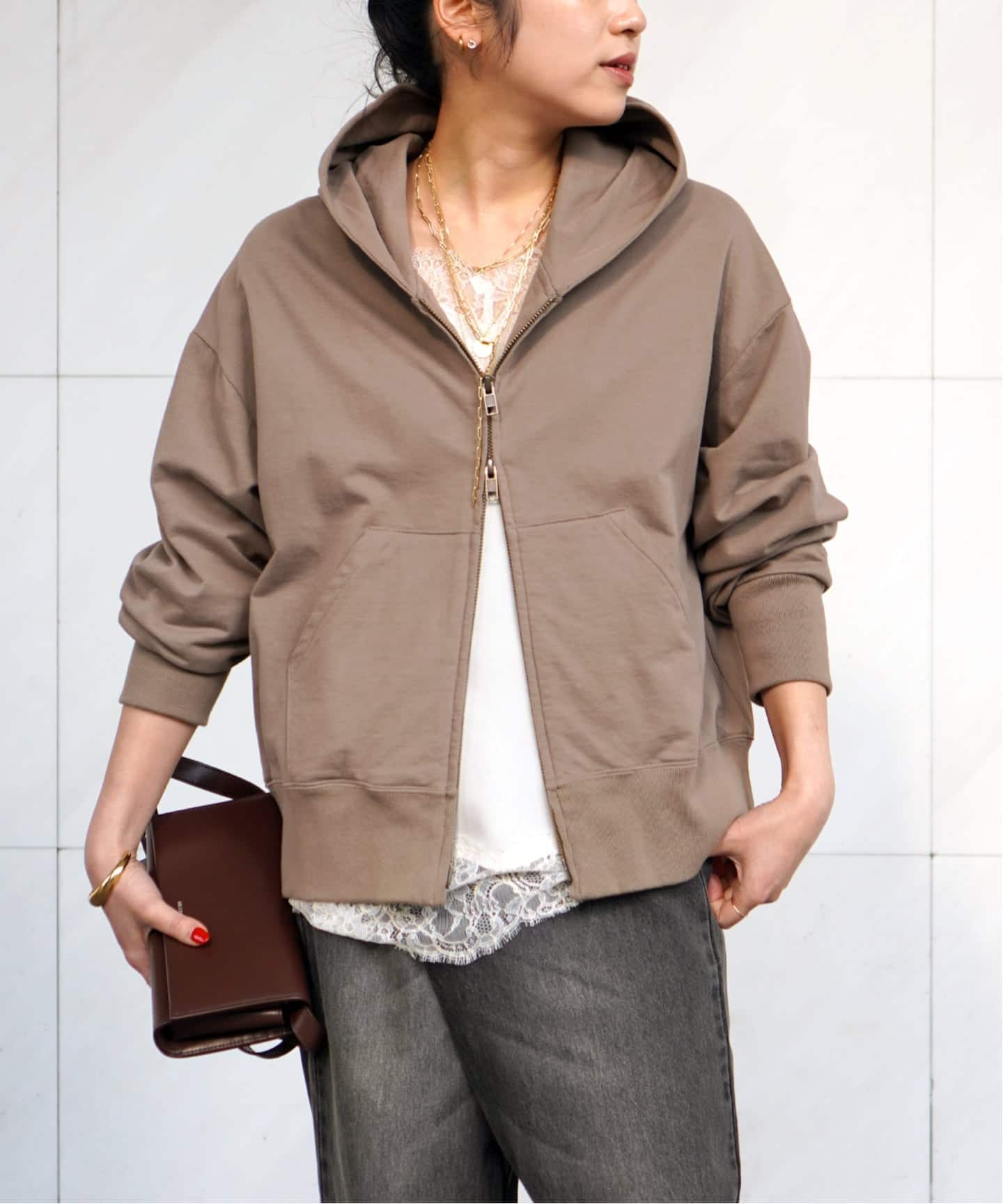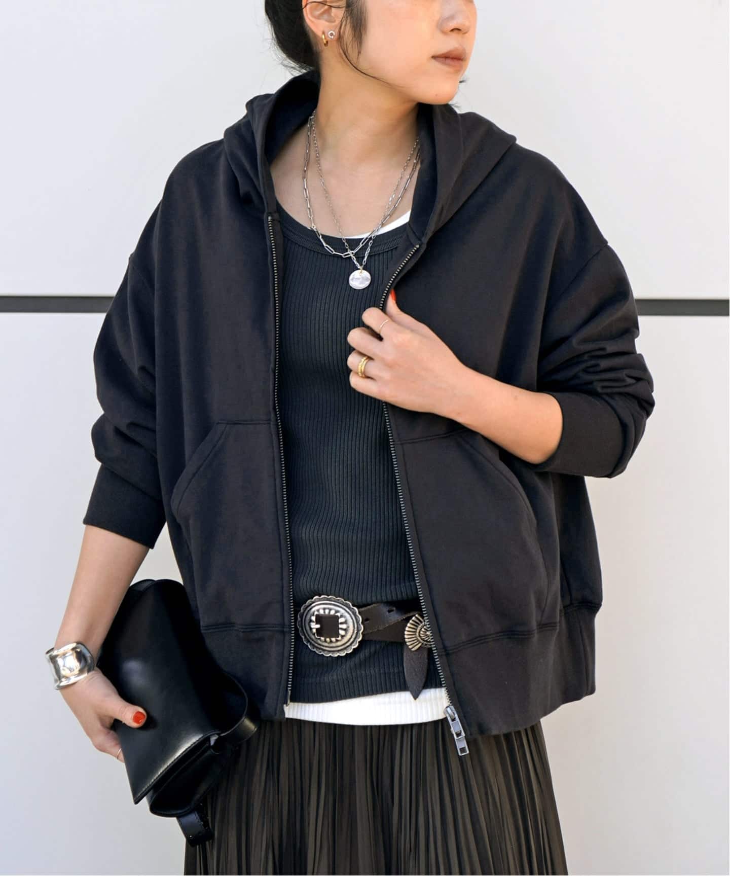 スカートと同素材のパーカーは、すっきりと着られるショート丈に。