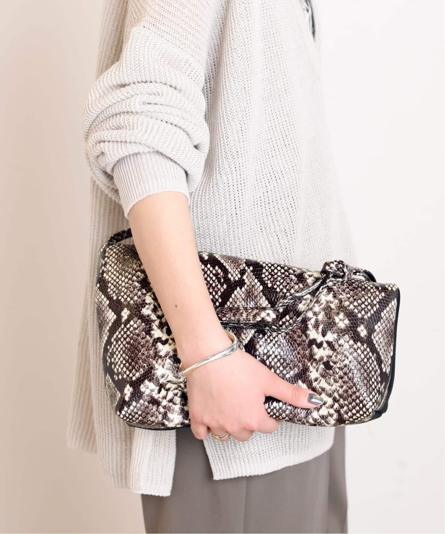 トレンドのパイソン柄とブラックスエードのコンビで、表裏で印象を変えられるアイテム。