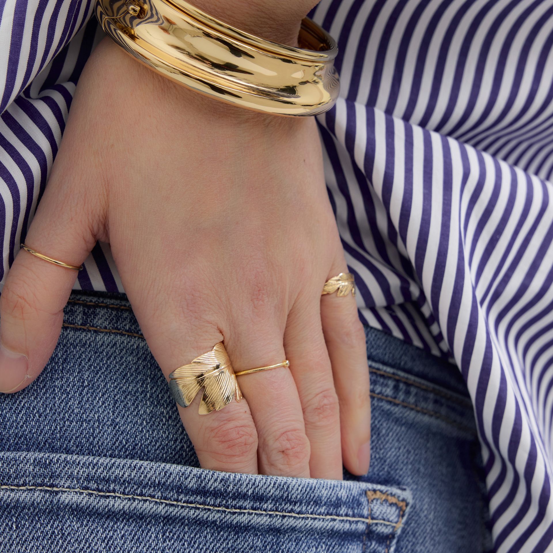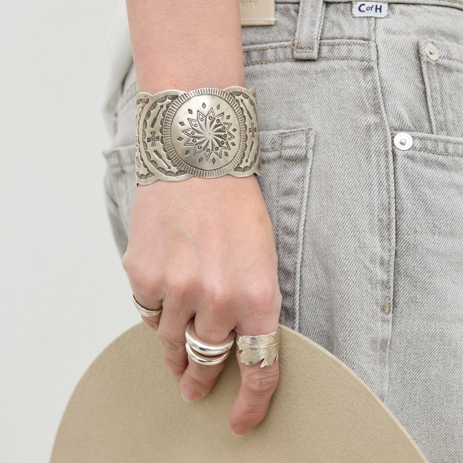 圧倒的な存在感があるカフは1つだけでスタイルが完成。使い込んだ風合いを感じられる味わい深さとハンドメイドならではの温かみが雰囲気を醸します。