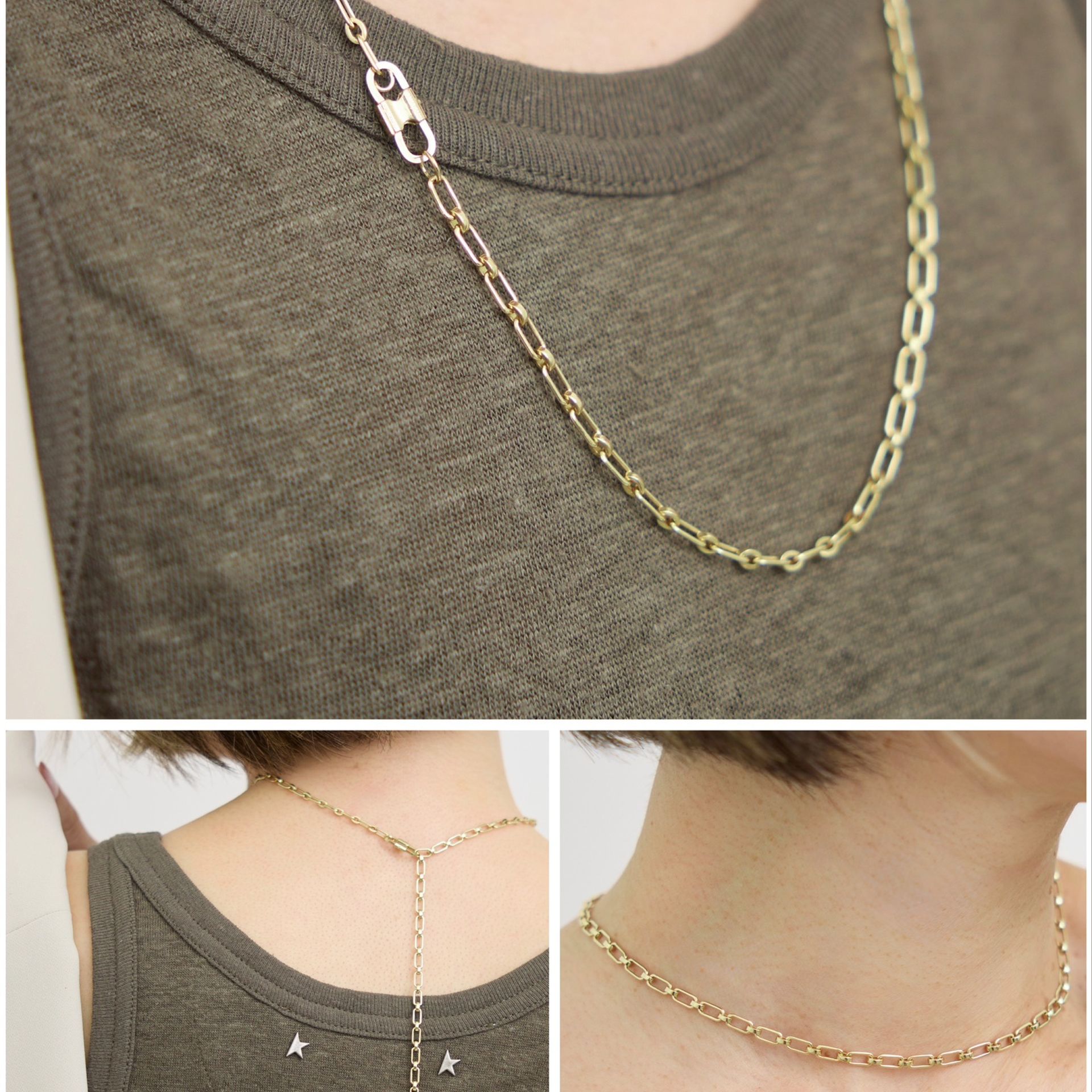 華奢な留め具やチェーンのバランスにもこだわりを感じます。2つの丸カンと留め具の3か所で長さを変えられるので、ネックの空きに合わせて調整ができるのもポイント。