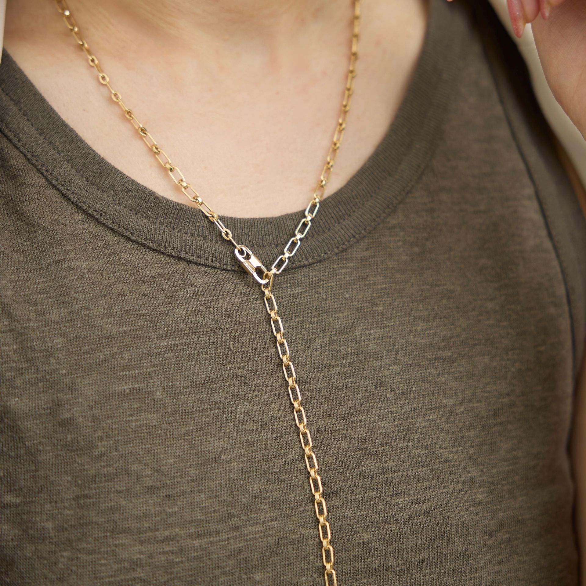 チャームやリングを通してペンダントのようにも、デザイナーはメガネホルダーのようにもアレンジ。程よい細さのため重ね付けもしやすく、自由自在なつけ方を楽しめます。