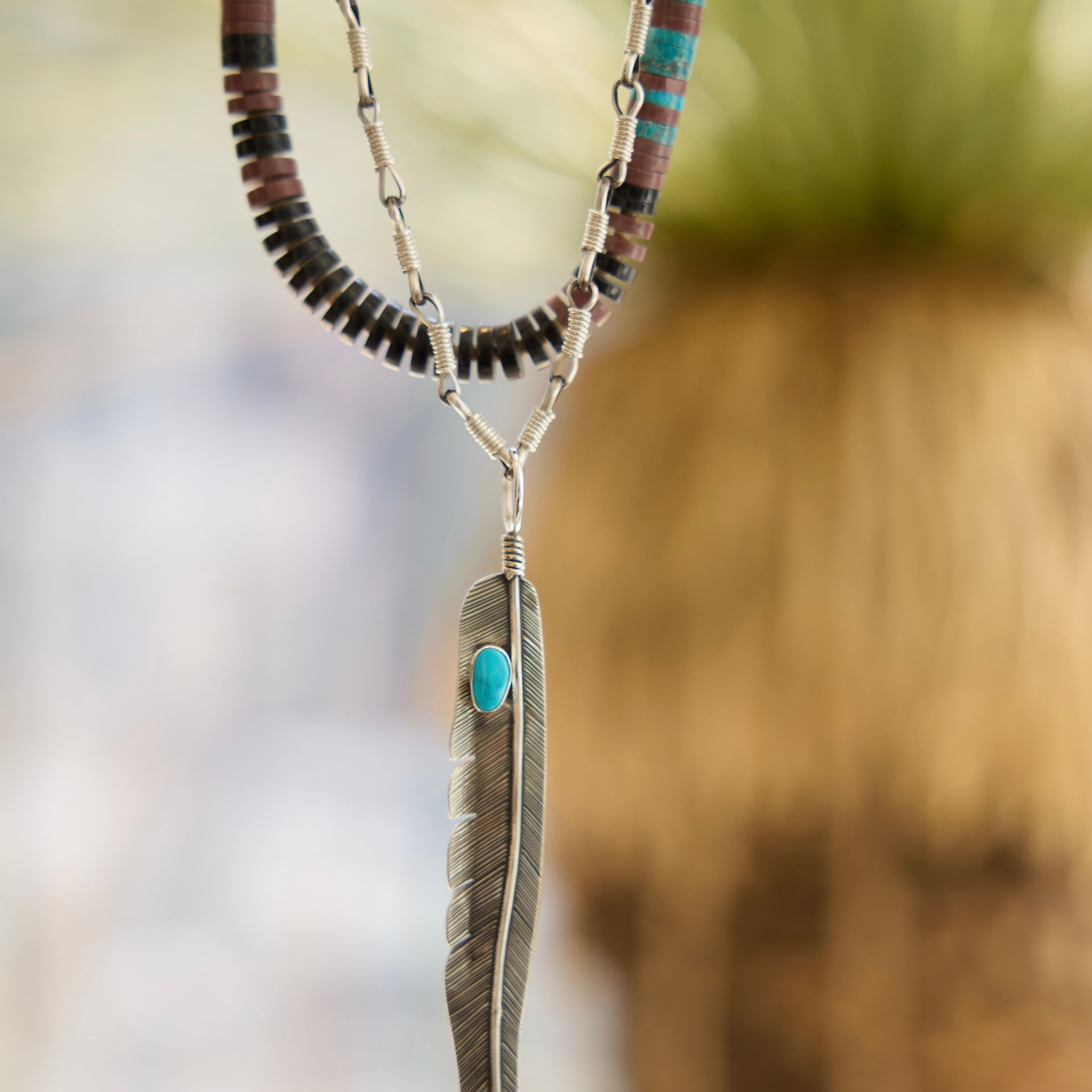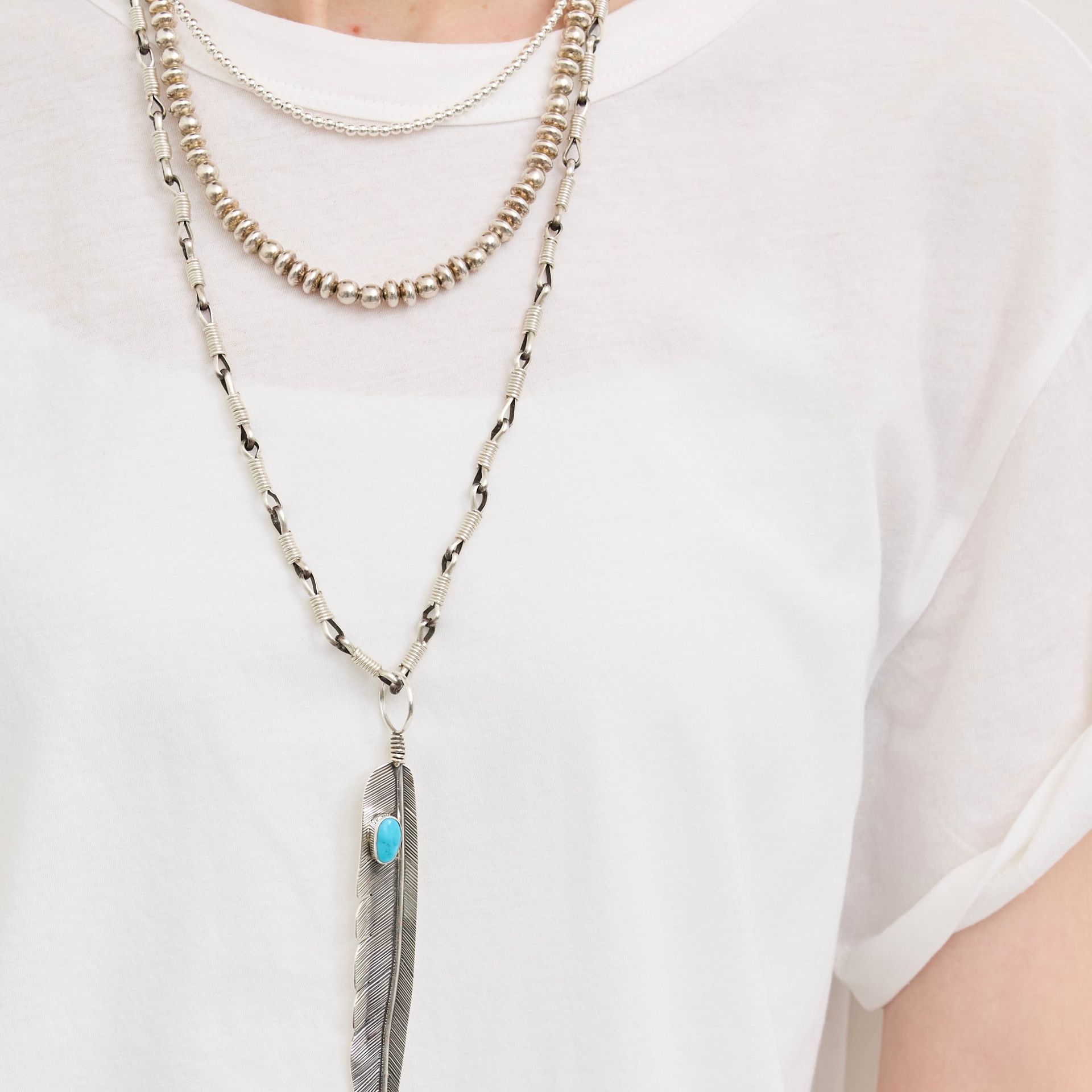 中でもフェザーネックレスはバイヤーも愛用しているアパルトモンだけのスペシャルオーダー。タフさがありつつ、身に着けるとすっきりと見えるバランスはHARPOならでは。ターコイズがアクセントになり、一つでも様になる存在感がかっこいい。