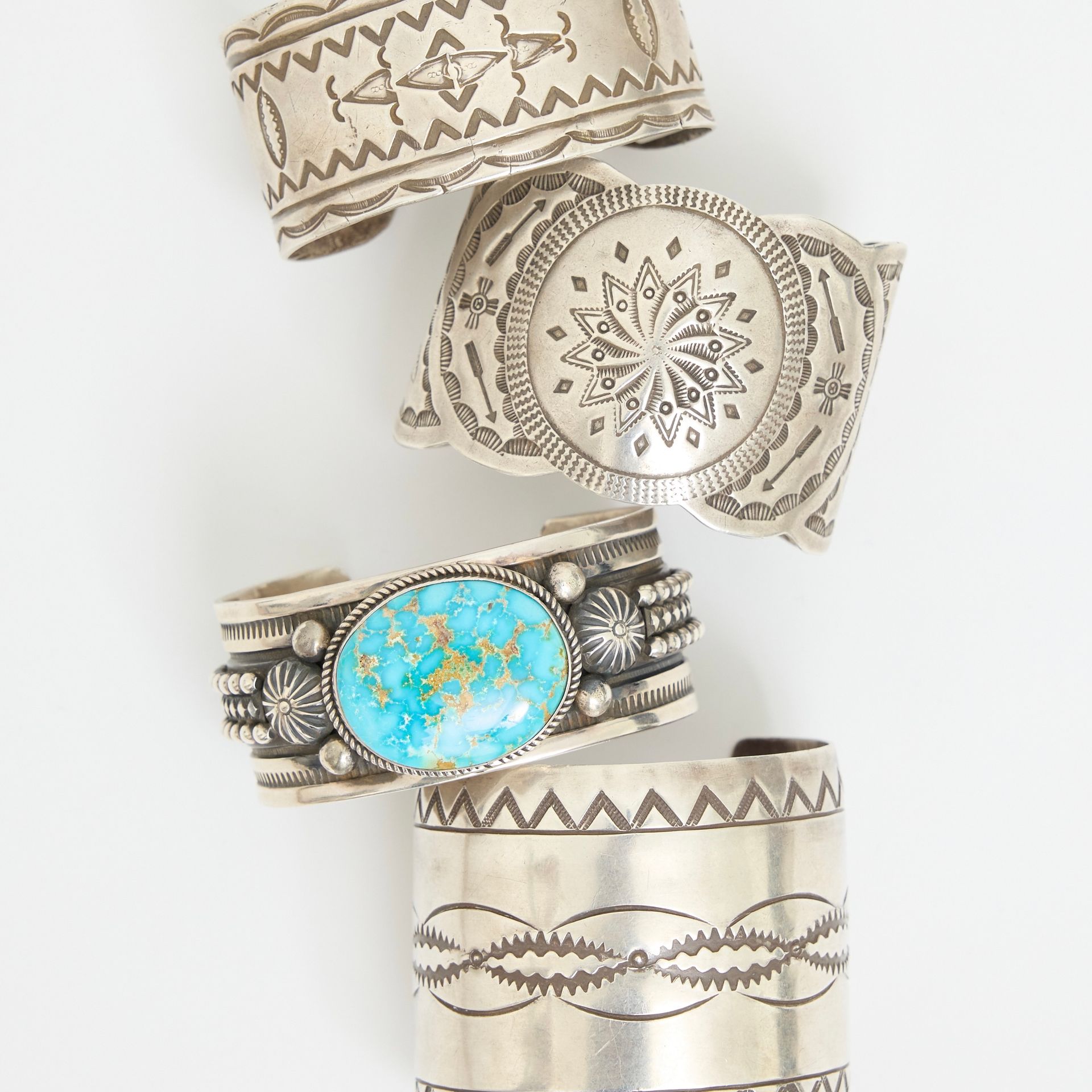 ヴィンテージナバホも一部店舗にてお取り扱いをしています。アメリカの先住民ナバホ族のシルバージュエリーは時間をかけ手作業で作られる1点もの。銀の板から叩いて形を作るスタンプワークはとても繊細で、職人ごとに柄が異なり、まるでアートピースのひとつ。