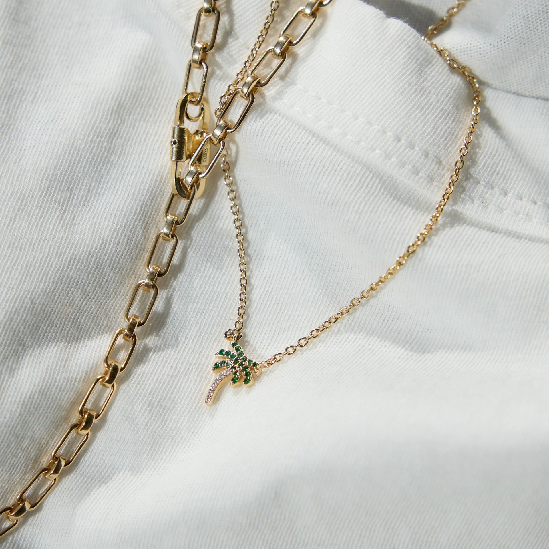 暖かくなるこれから、パームツリーは特におすすめのひとつ。14KYGにグリーンガーネットとダイヤモンドが素肌の上でさりげなく煌めく華奢さが大人の外しにちょうどいい。