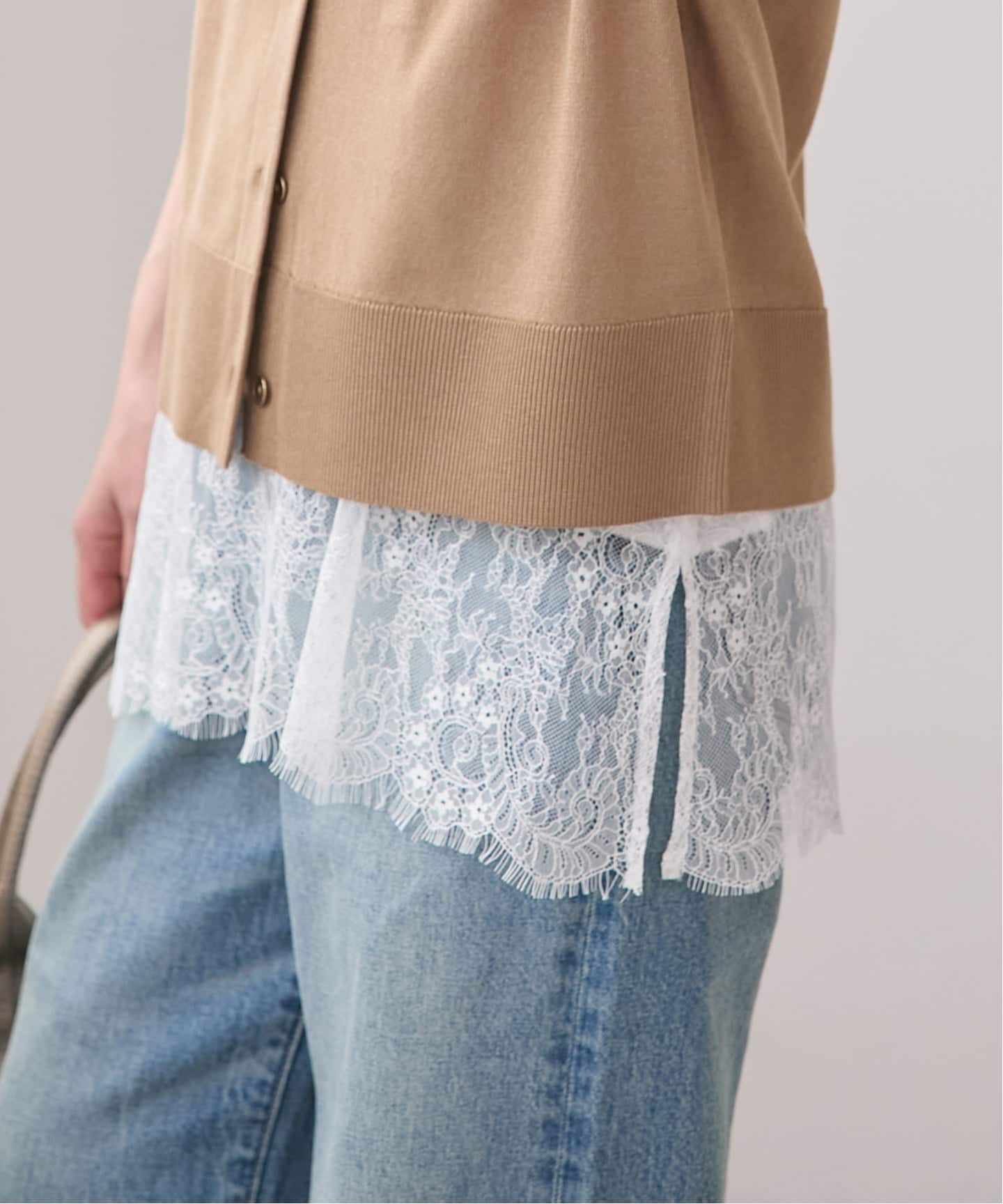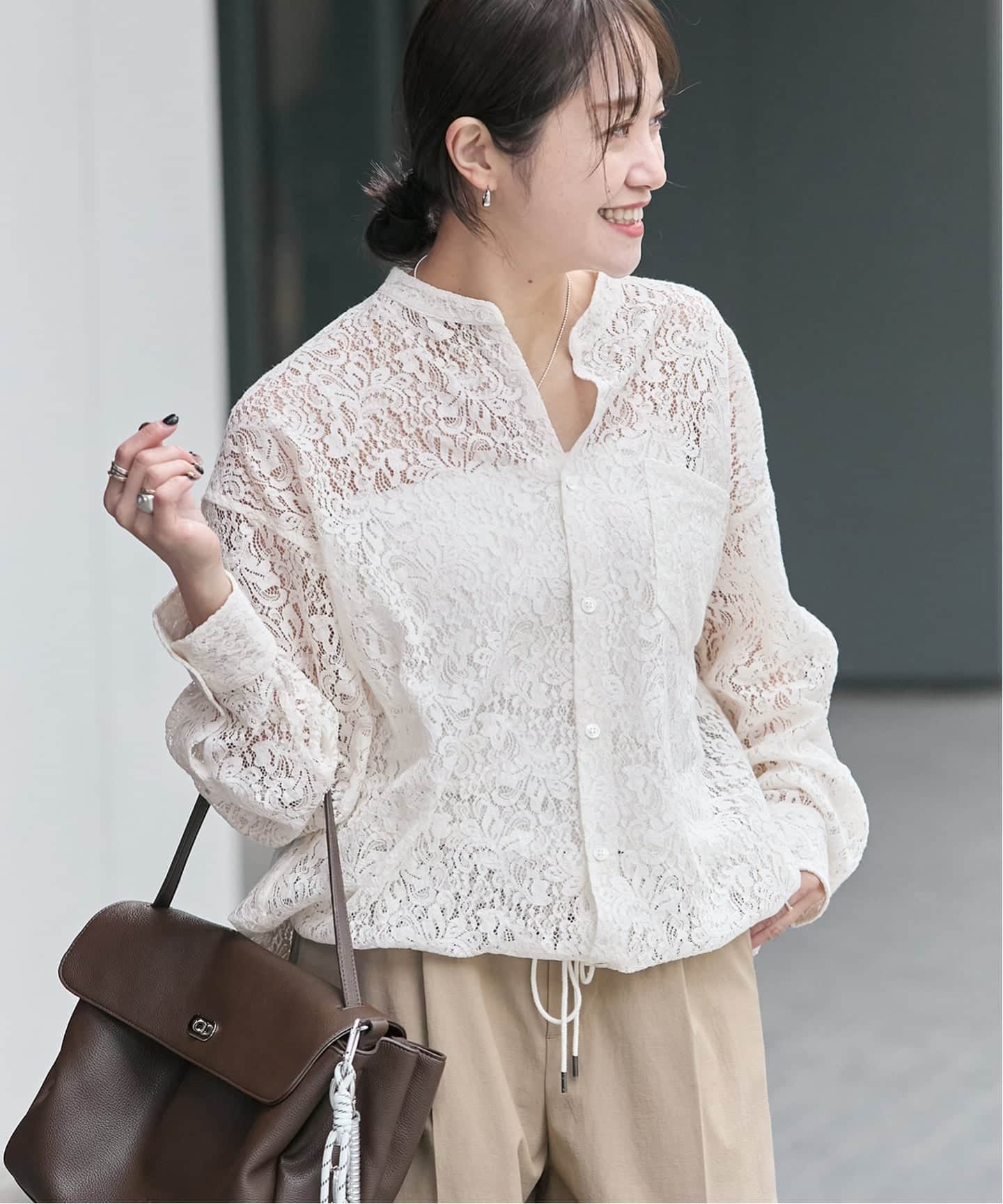 緻密なレースが、女性らしく柔らかな空気感を纏わせてくれる一着。