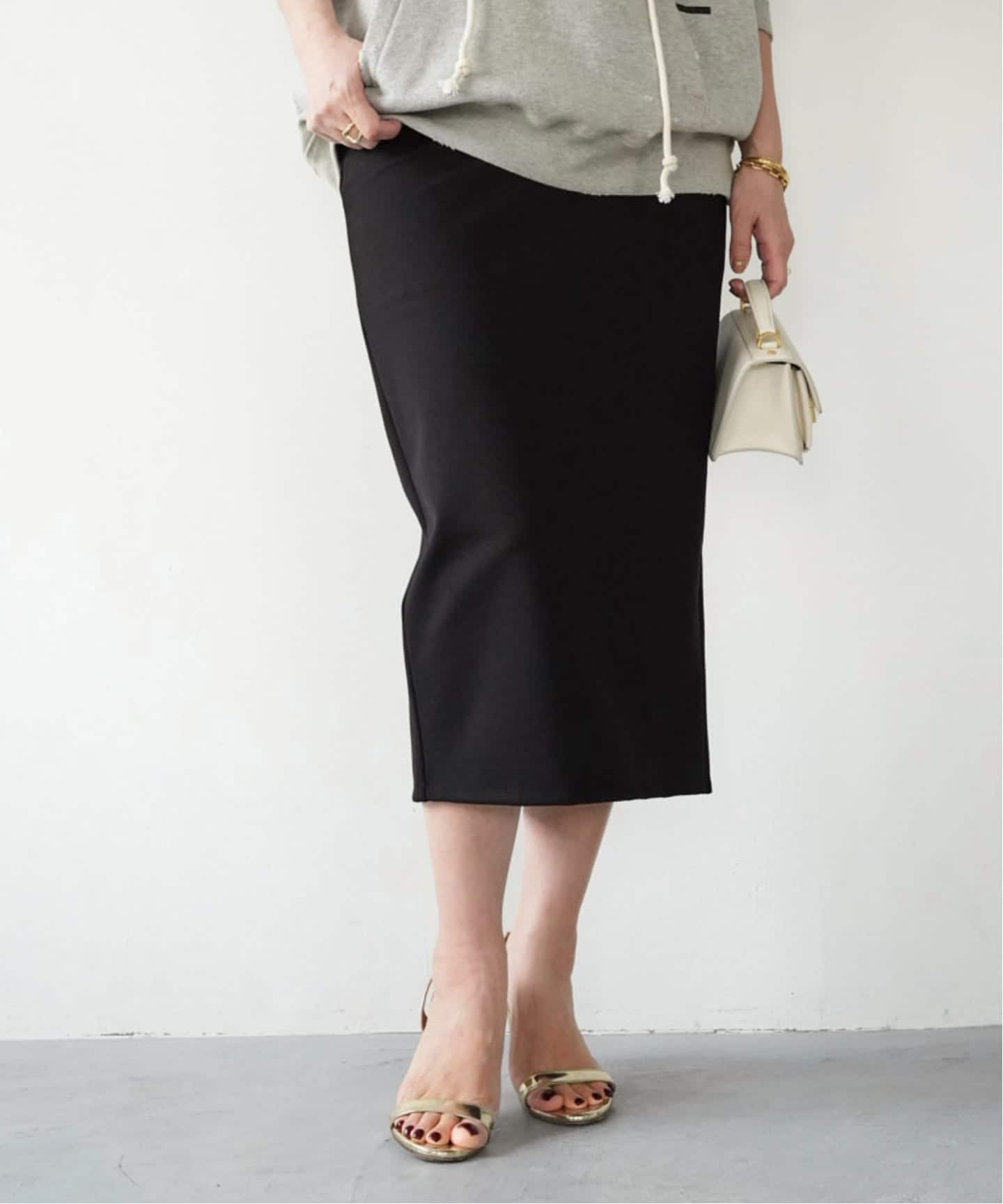 タイトスカートを窮屈感なくデイリーにも履きこなせる。上品な素材感でON対応ももちろん、美しいシルエットをカジュアルアイテムに合わせるコントラストも楽しい。