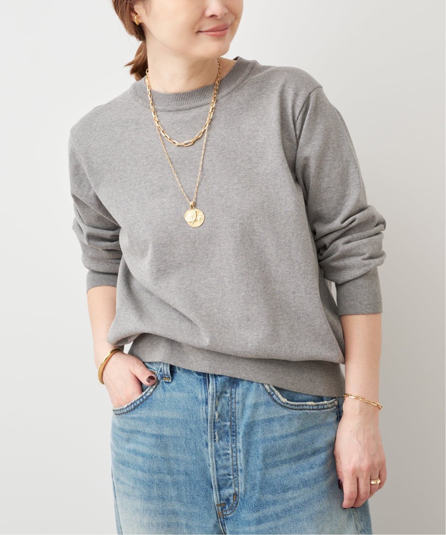 シャープなネックラインにたっぷりの袖のコントラストがムードをつくる。薄手のスウェットはニットよりもぐっと軽やかで梅雨時期まで頼りになりそうな予感。