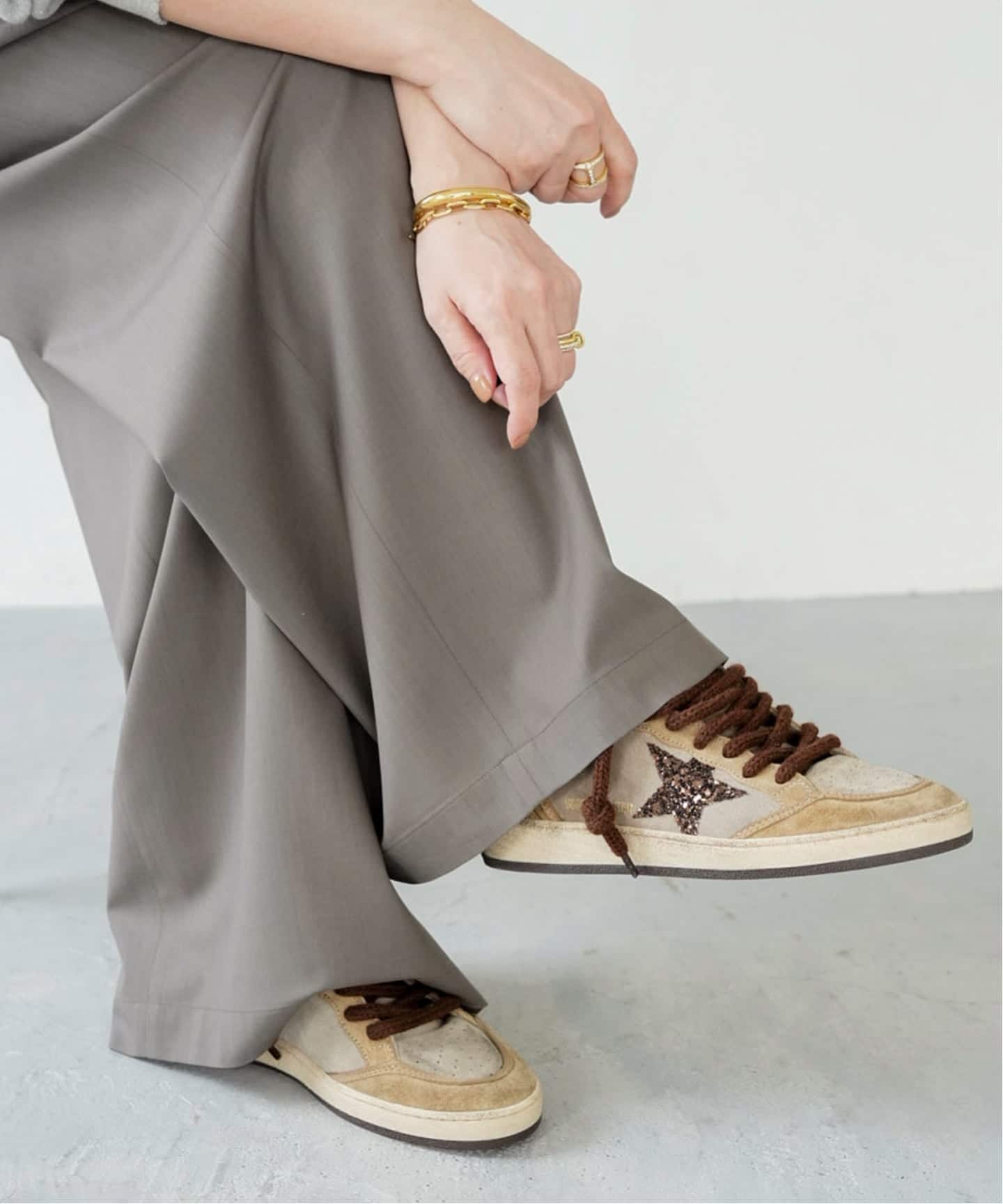 ヴィンテージ加工や大胆なプリント。煌めきにボリュームあるシューレースのバランス感がGOLDEN GOOSEらしさを物語るスニーカー。