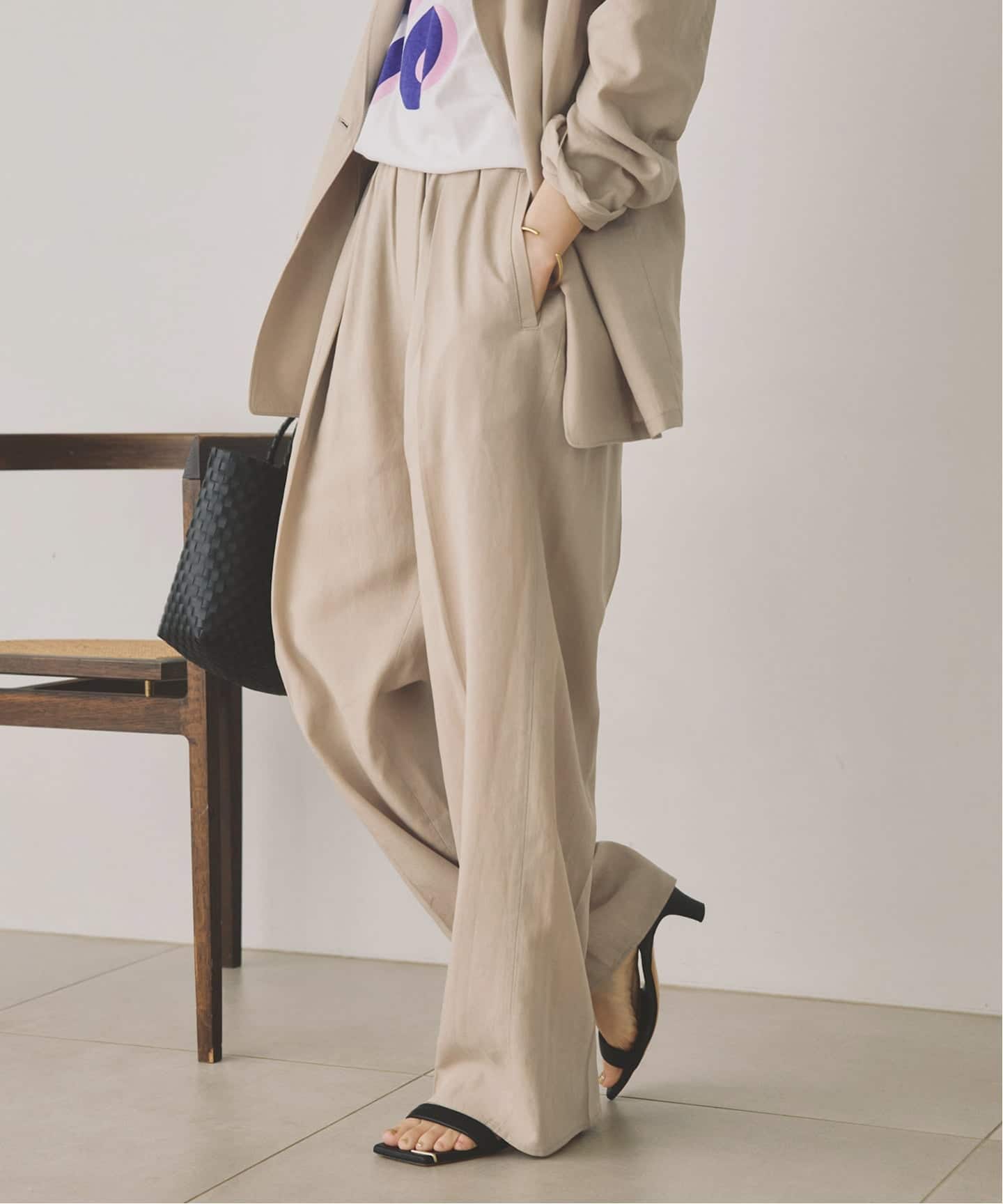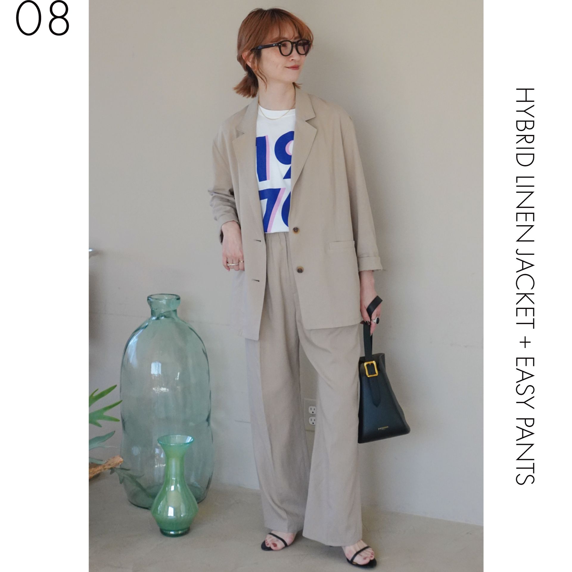 セットアップは、リネンならではのラフさはありつつも、適度なツヤやドレープ感が上品な印象なので、