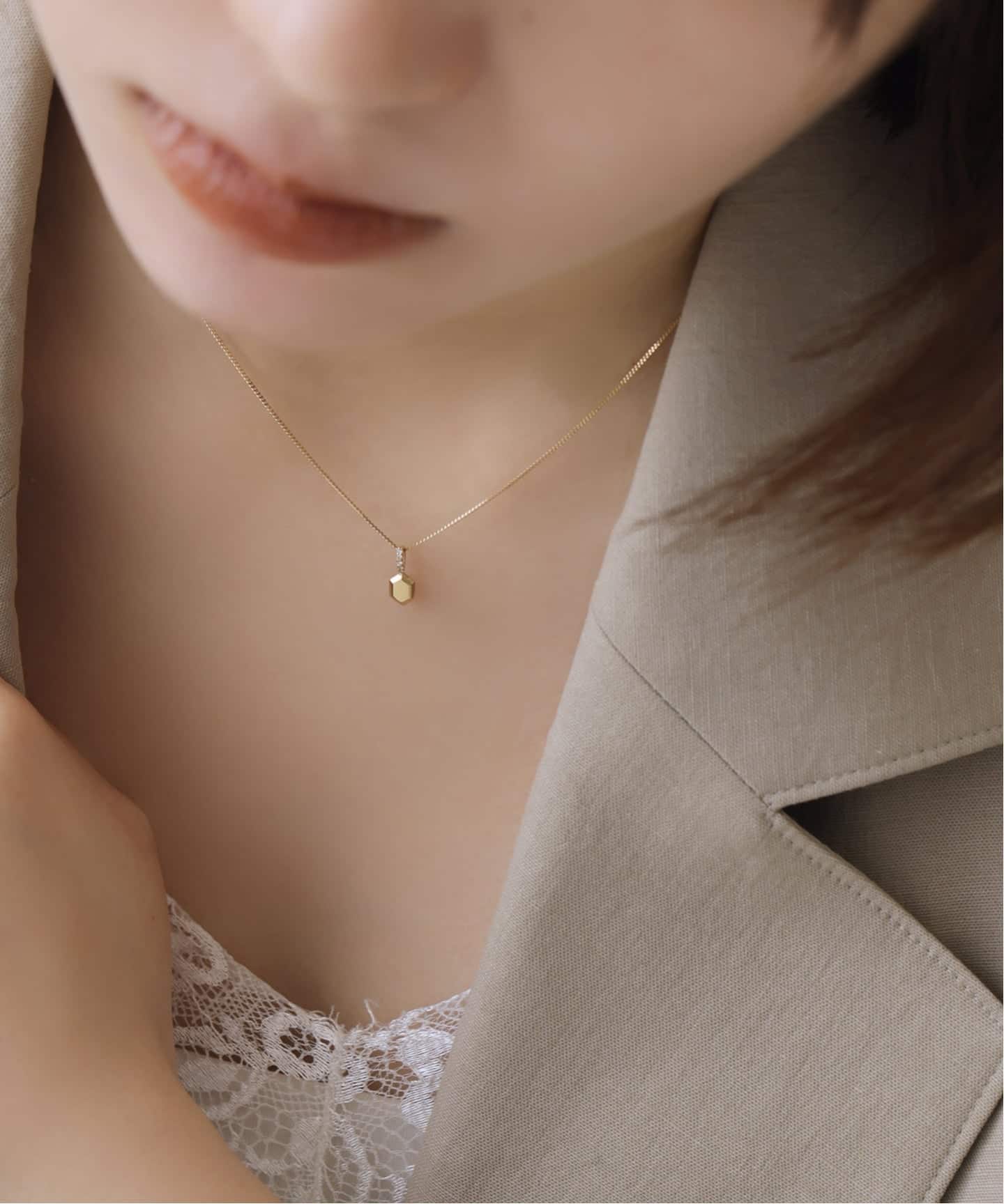 華奢なキヘイチェーンに、サークルとヘキサゴンモチーフのチャームを重ねて。