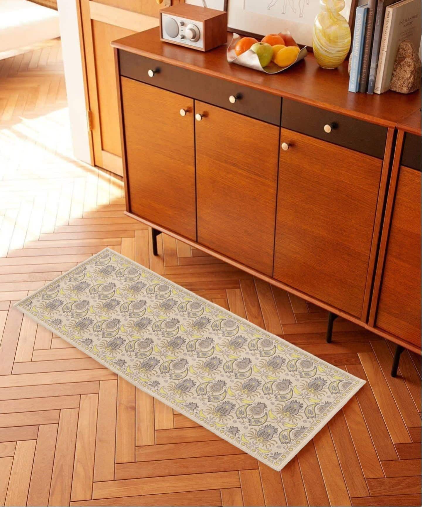 伝統的な模様をプリントで表現することで、手織りラグの雰囲気や奥行きを感じさせながら、コストを抑えた一枚に仕上げました。