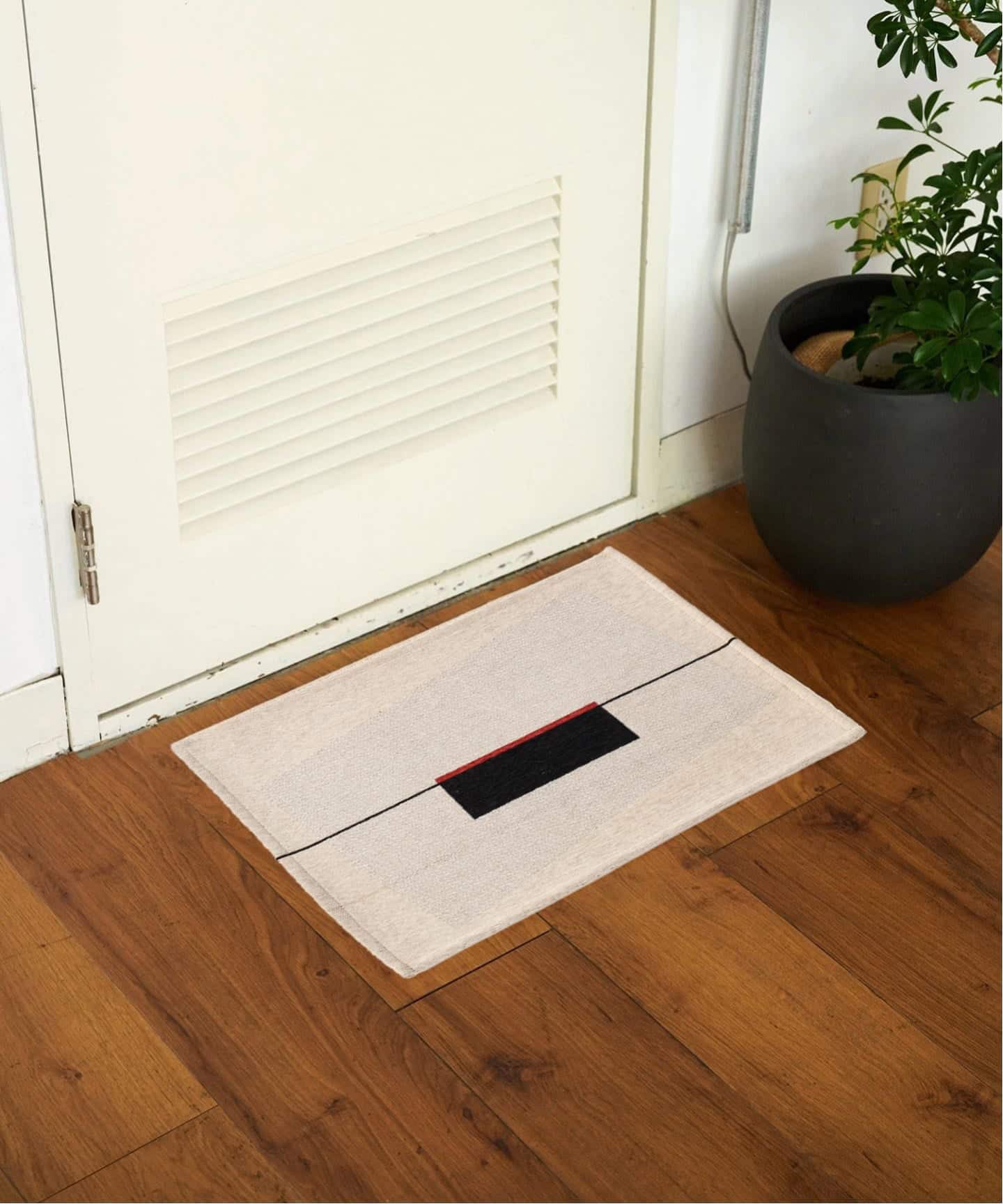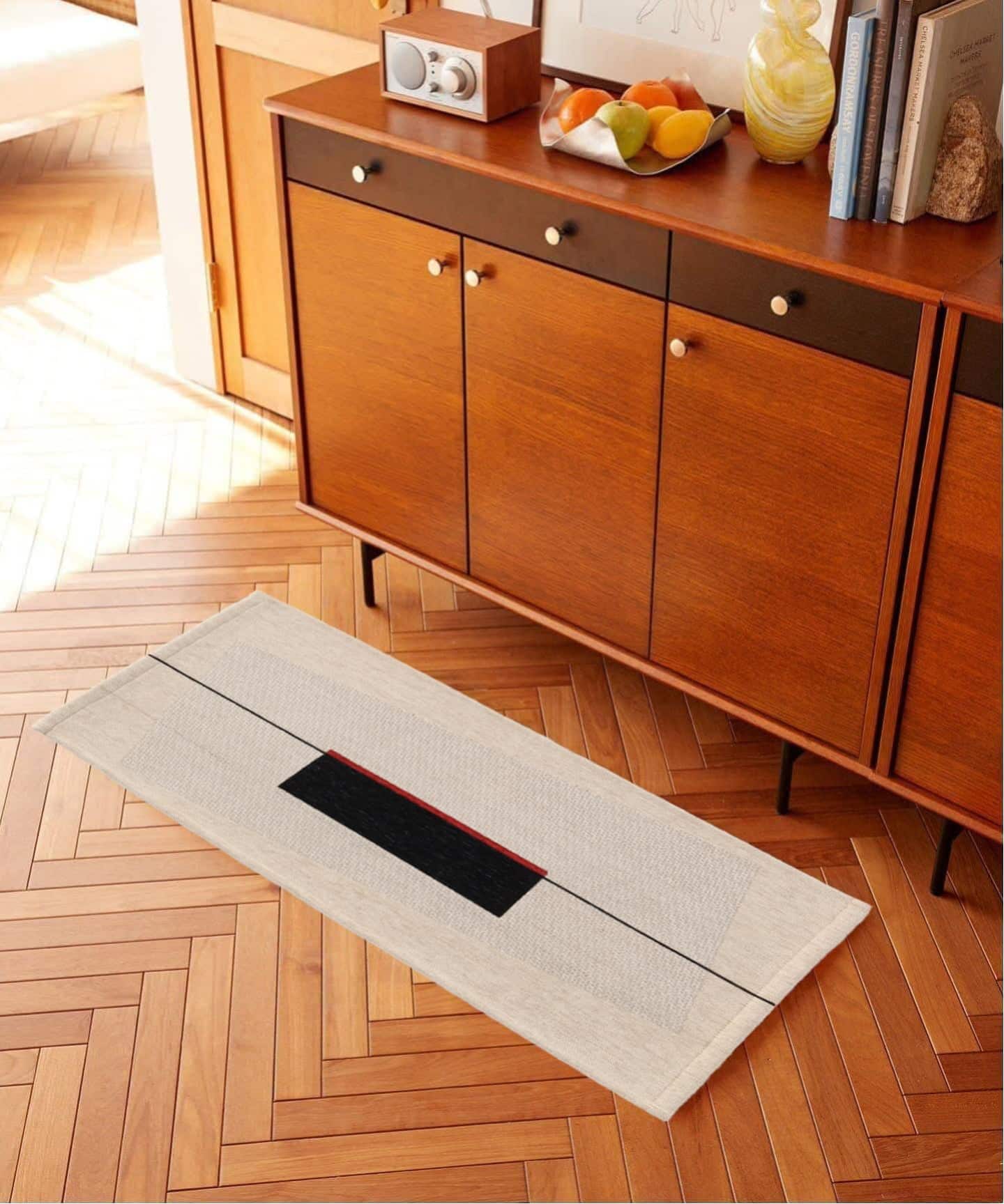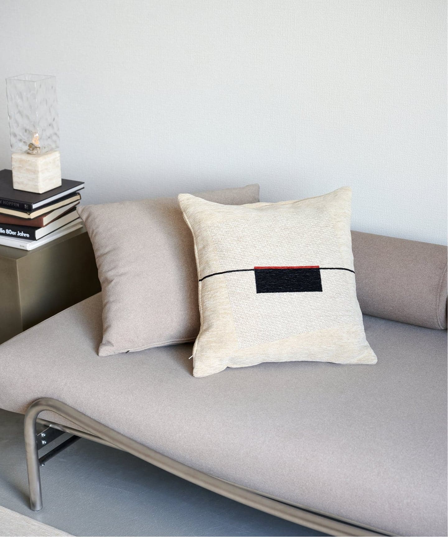 ナチュラルなベージュ生地の中央に、幾何学的なモチーフを大胆に配置。控えめな凹凸感のある織り地と、ブラック×レッドのアクセントがモダンな雰囲気を演出します。