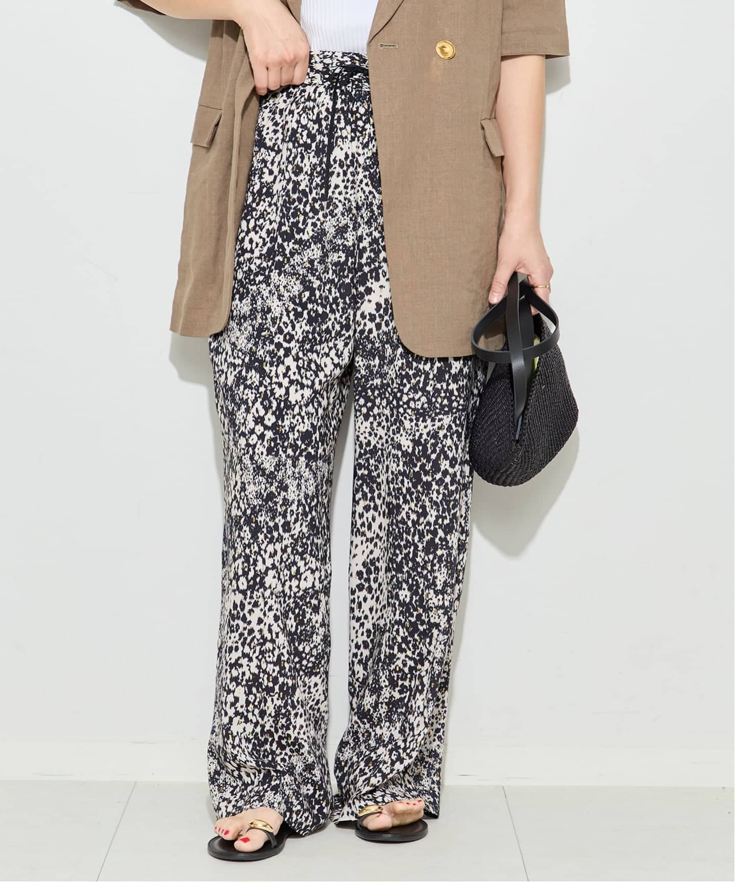 DEVEAUX社の生地を使った柄パンツはラメの金糸が入り華やかな印象に。