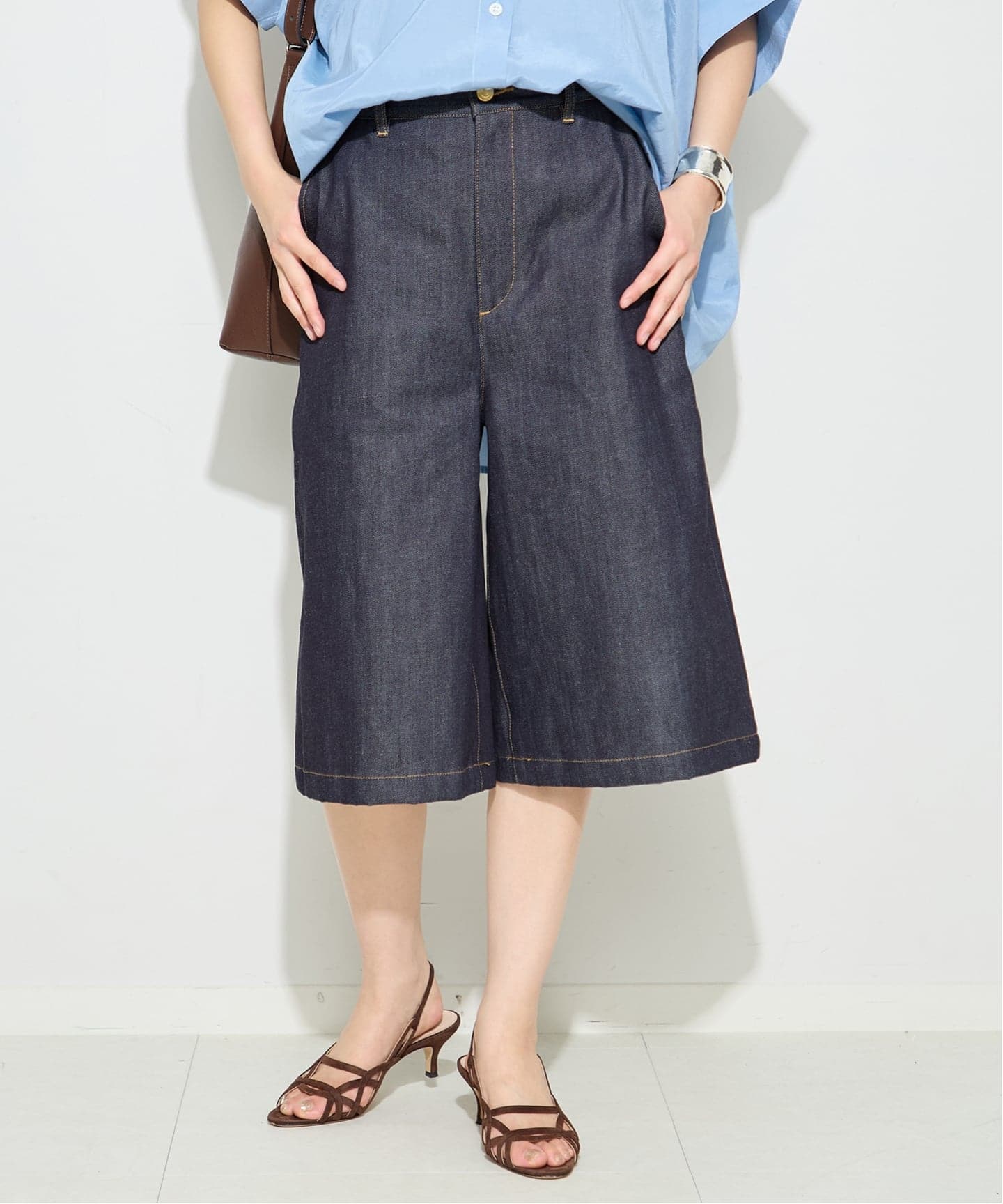 デニムのハーフパンツは大人が着やすい長めな着丈に。