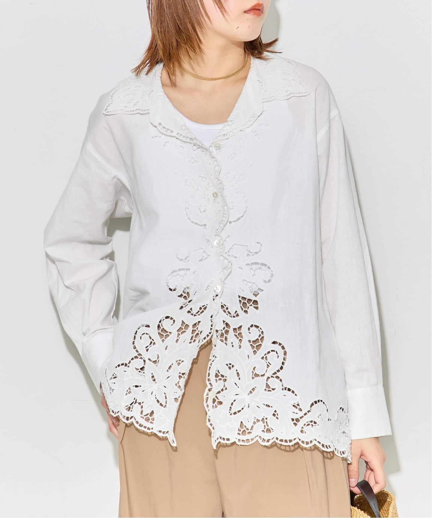 大ぶりなレースが目を惹くL’ESSAGE一押しのレースシャツ。