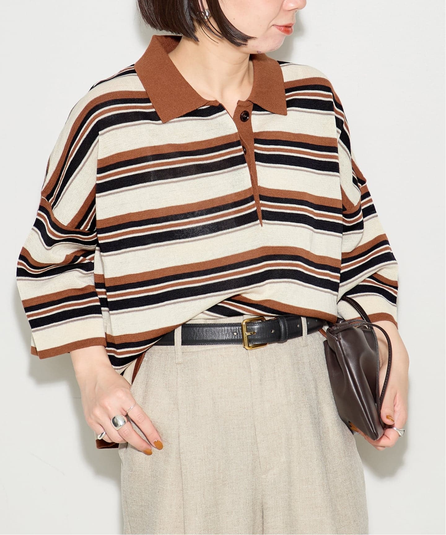 配色が可愛いボーダー柄のポロニット。