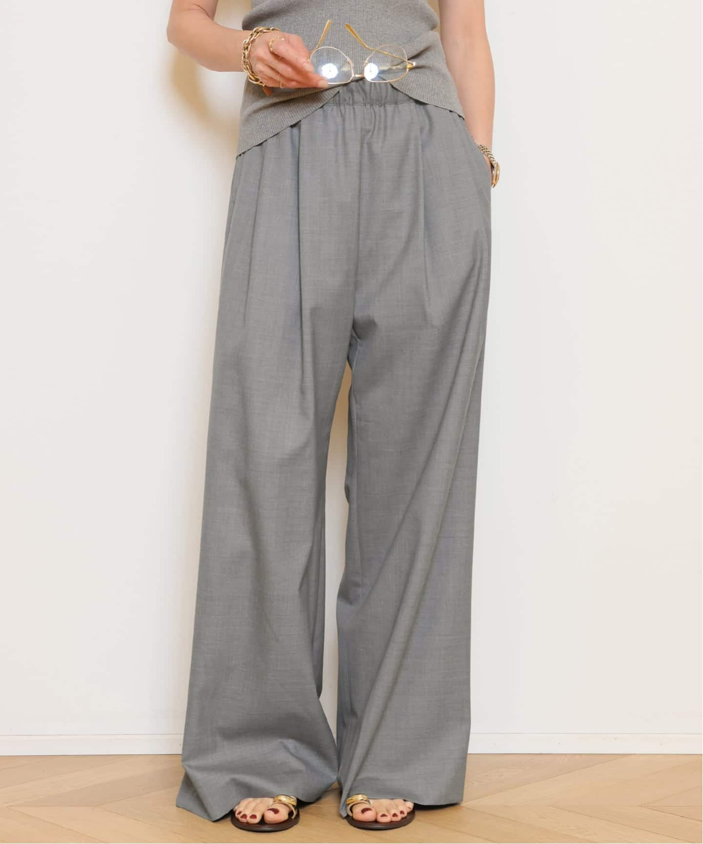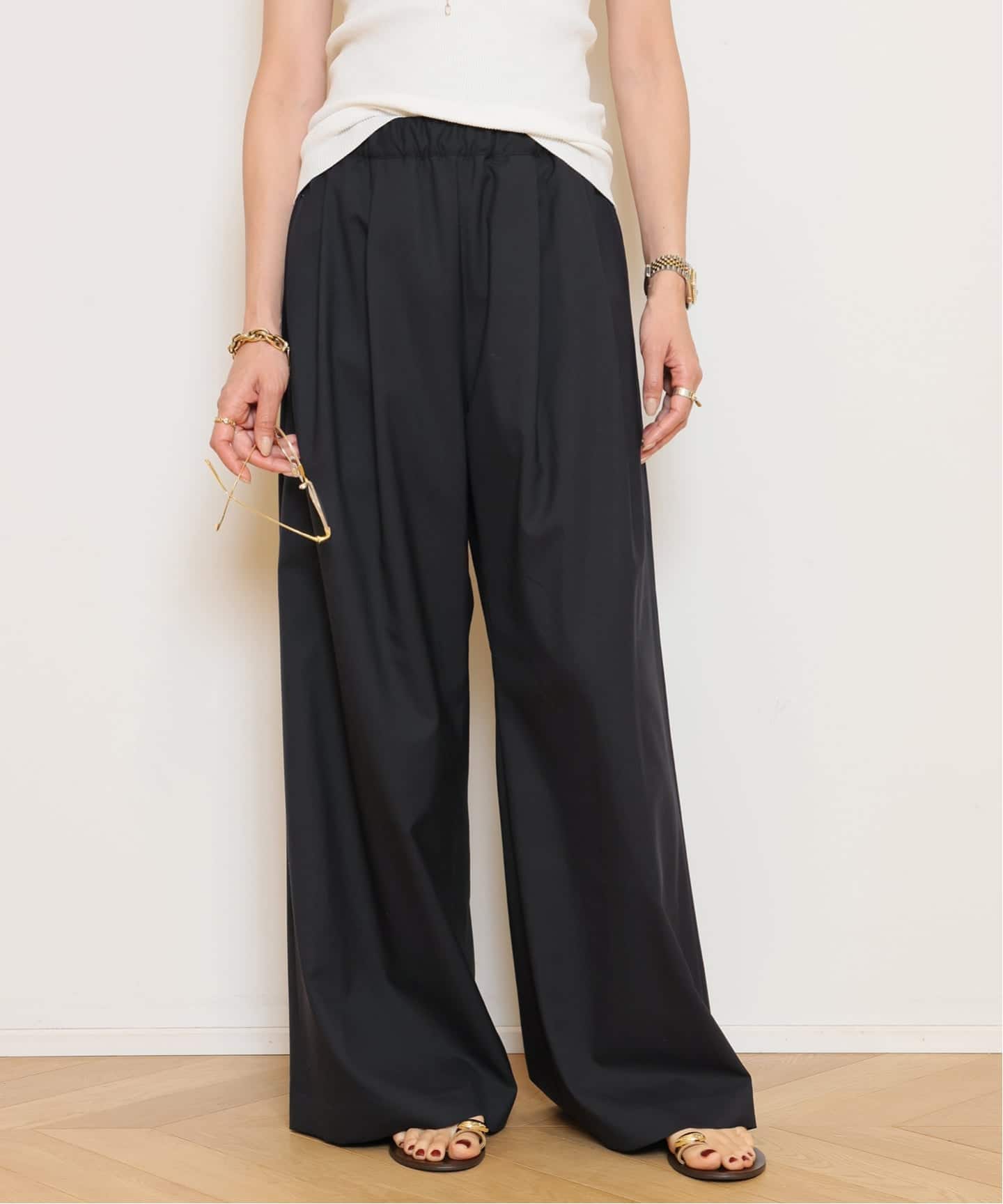 シルキーサテンの程よい肉感と落ち感が魅力のパンツ。ラインを拾いすぎず、脚をすっきりと長く見せてくれます。