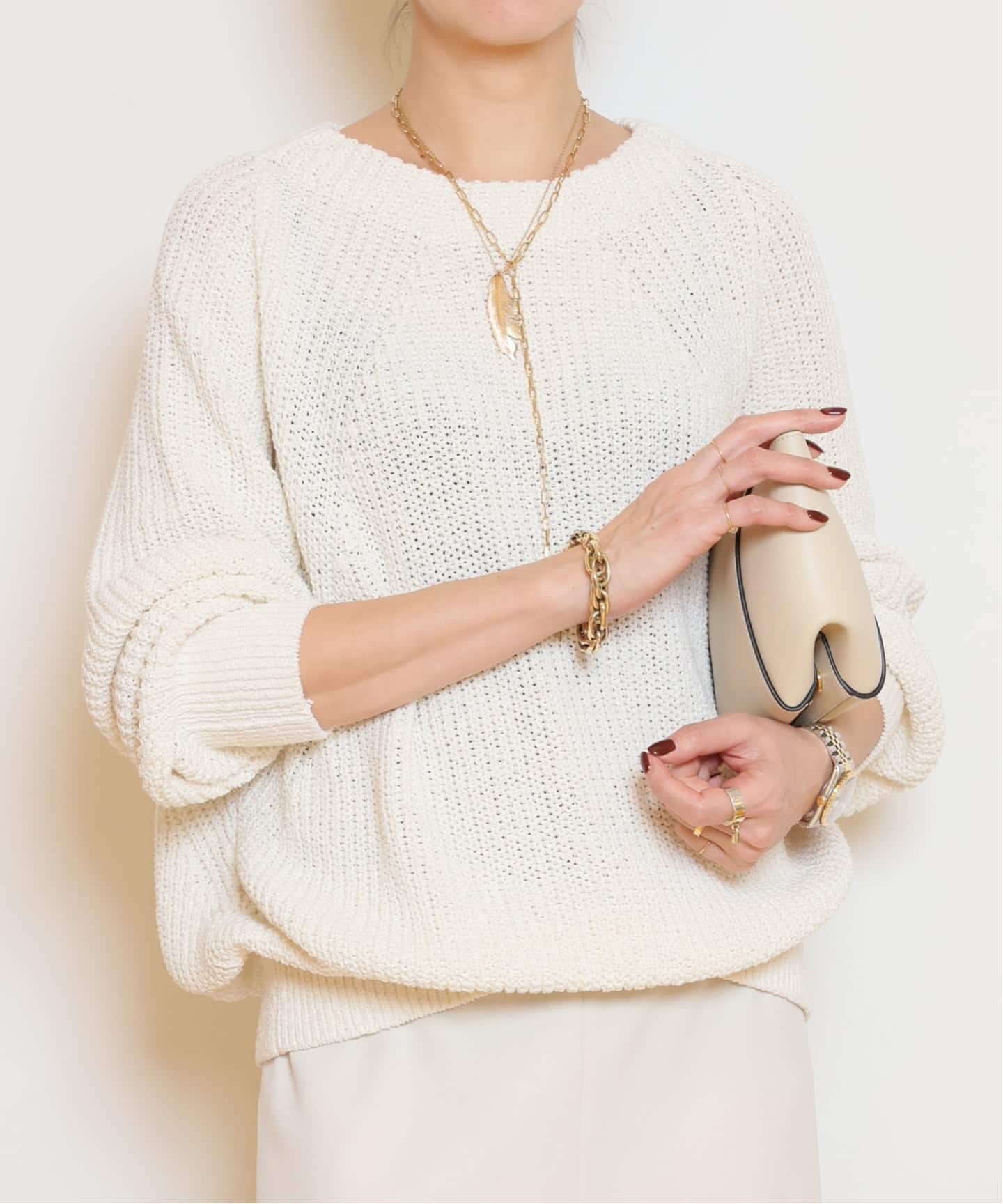 袖にはスリットを施し、抜け感のある印象に。長めのスリットが手首を華奢に見せ、腕のラインを美しく引き立てます。