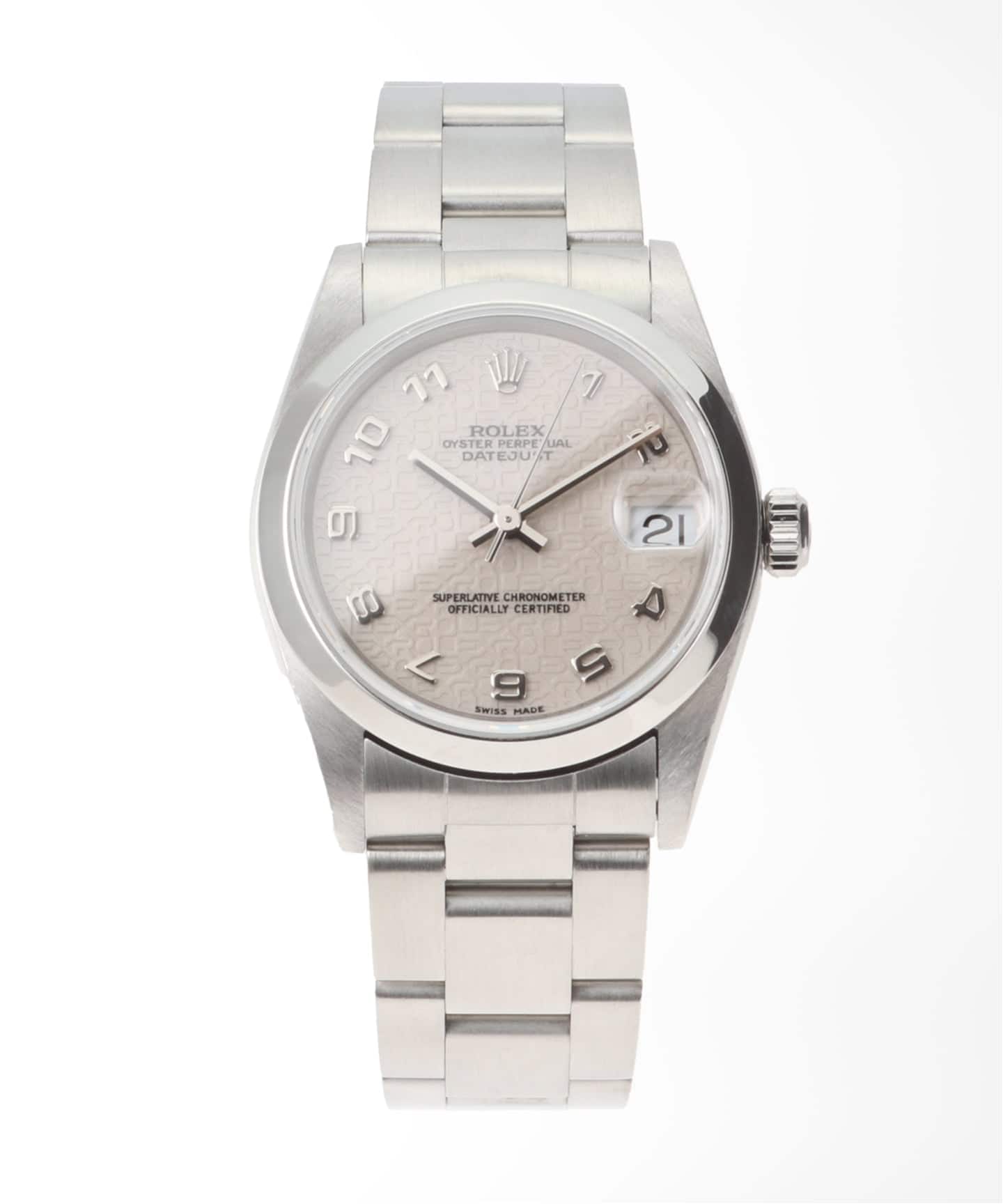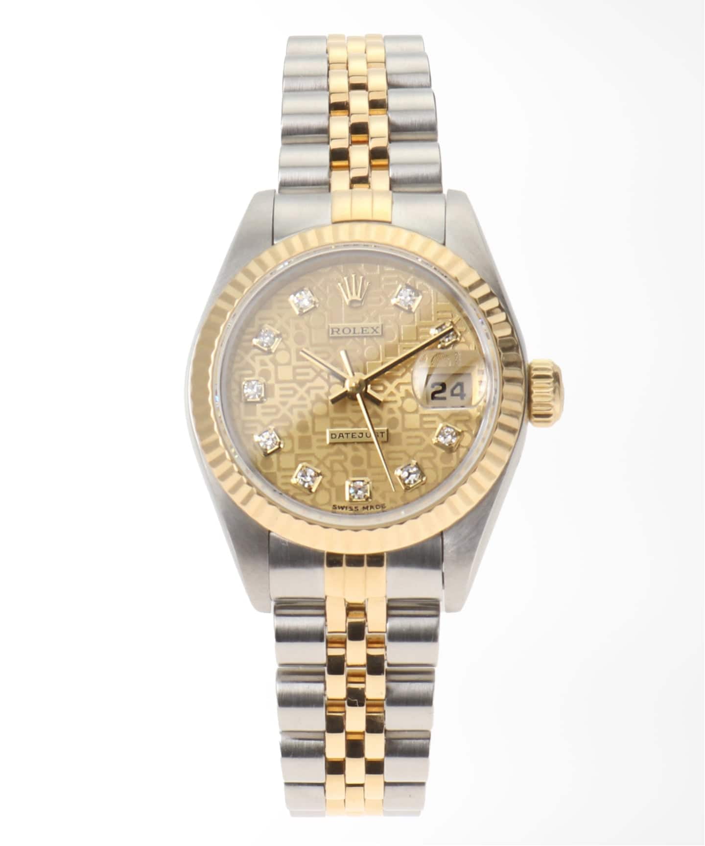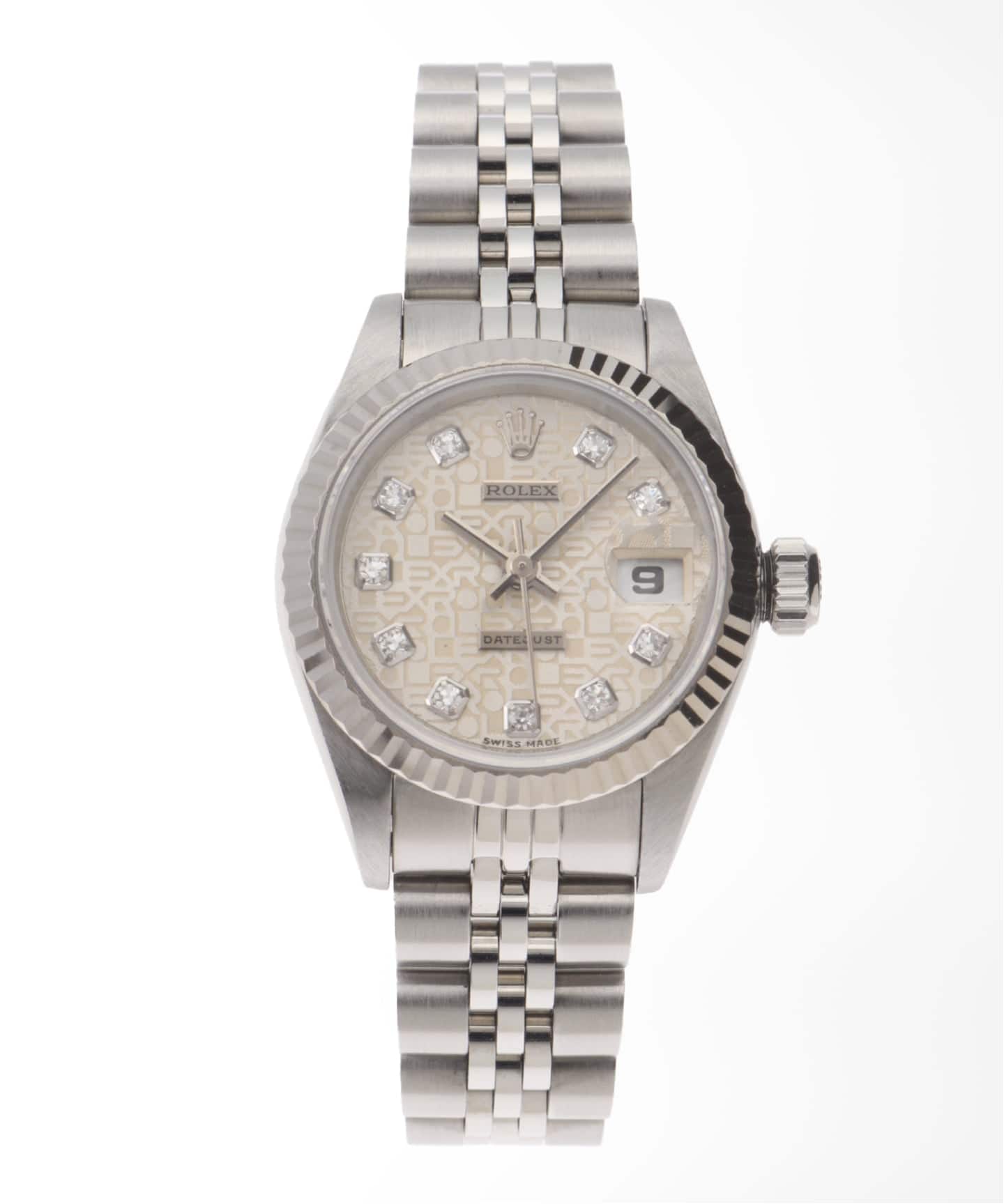 リファレンス69173の中でも、ひときわ個性が光る10ポイントのコンピューターダイヤル。規則的に刻まれた“ROLEX”モチーフのパターンが、光の角度によってさりげなく浮かび上がり、奥行きのある表情を楽しめます。さらにダイヤモンドインデックスが加わることで、華やかさもほどよくプラスされます。