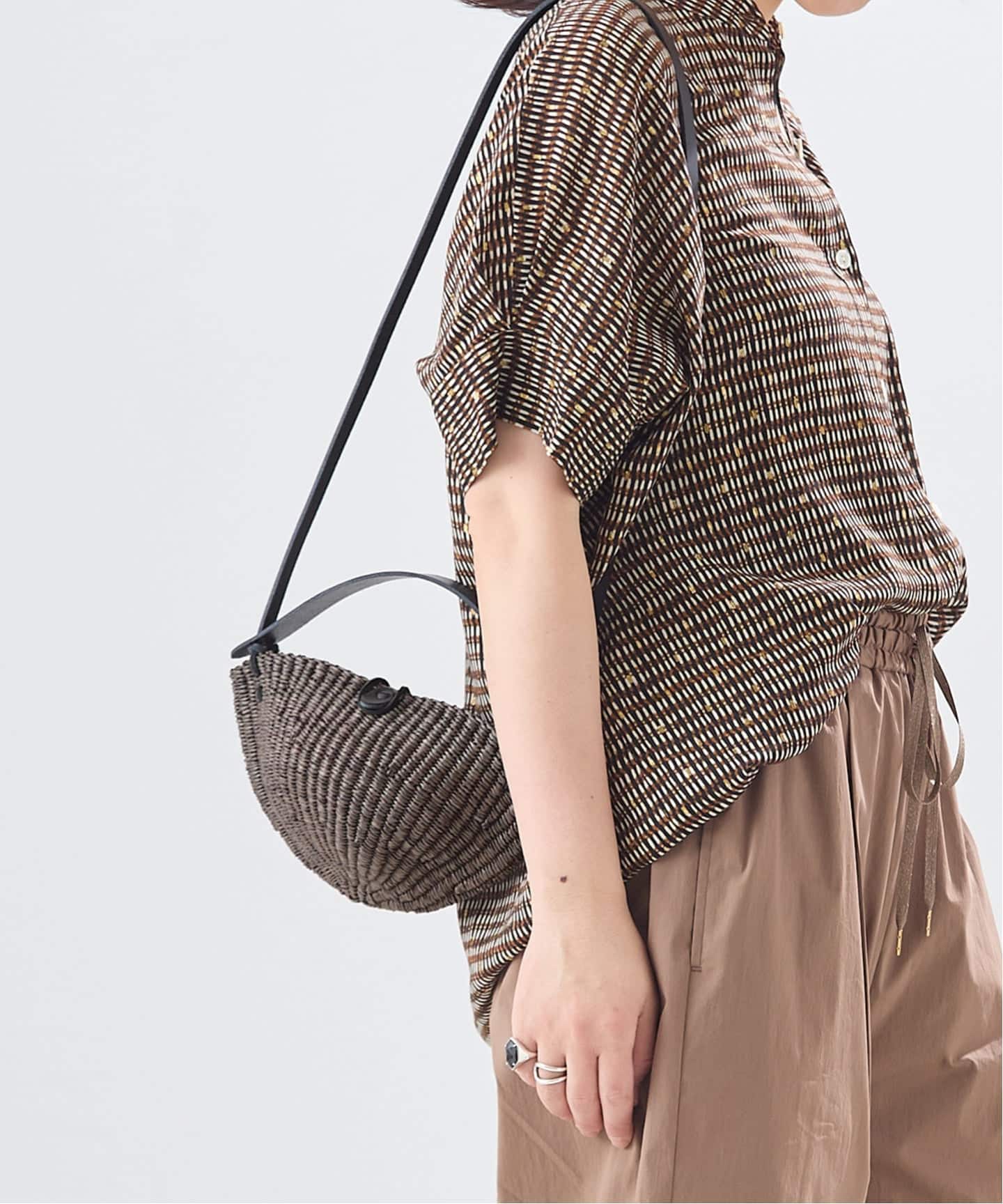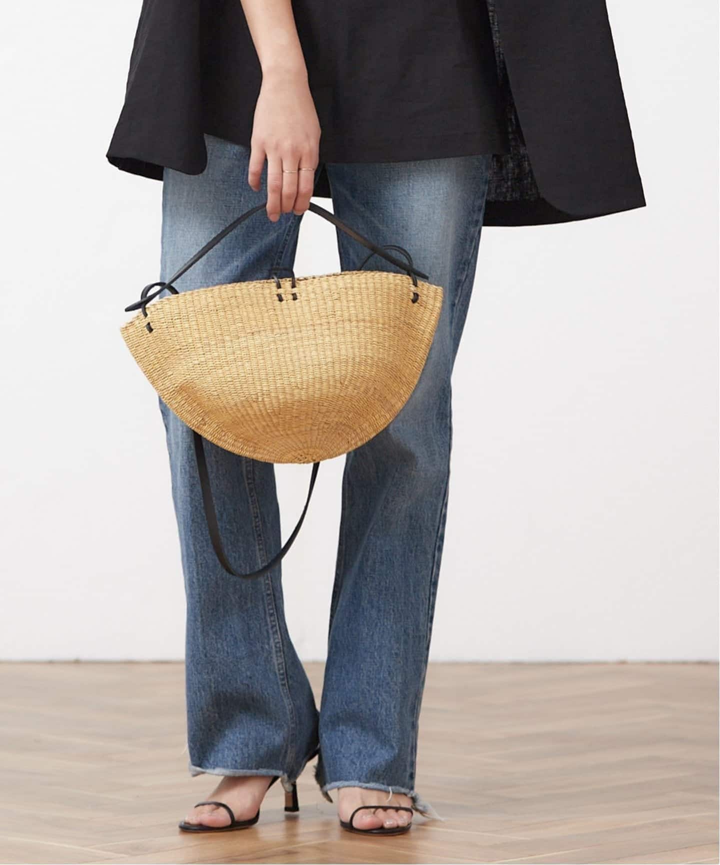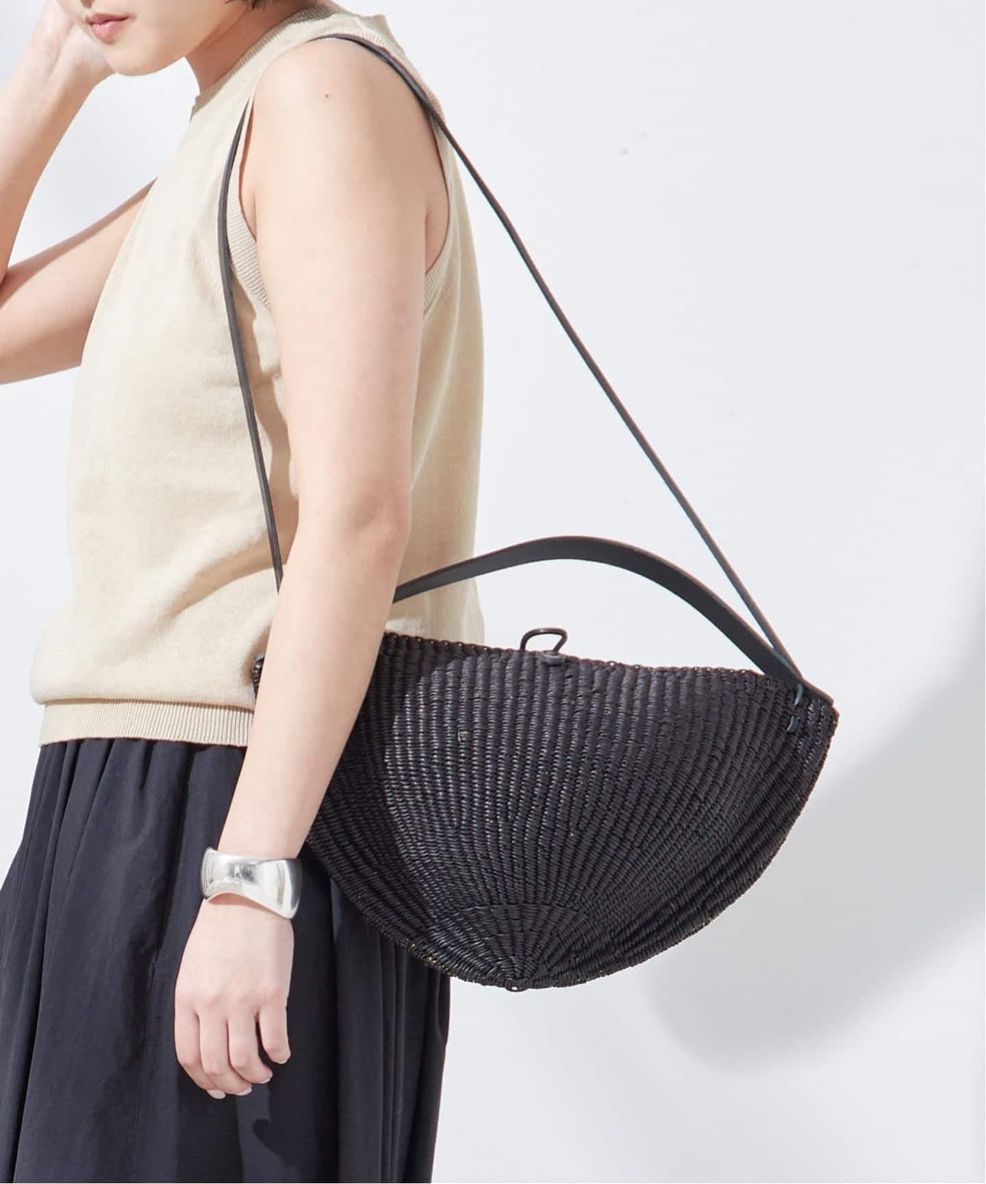 レザーの紐と他にないシルエットが、かごバッグでもモダンで都会的な印象に。