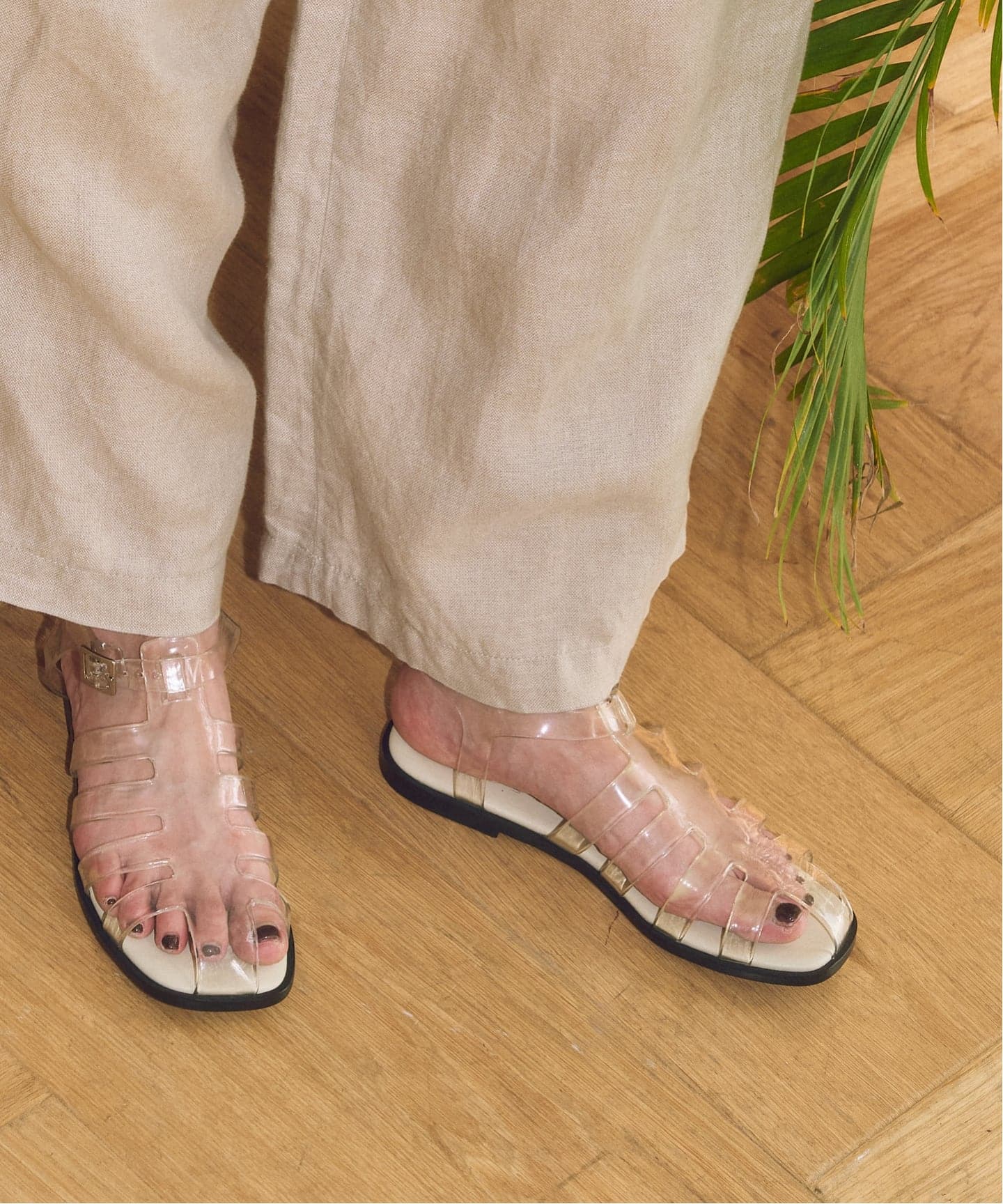 クリアなPVCのアッパーが、抜け感とモードな雰囲気を与えてくれるフィッシャーマンサンダル。