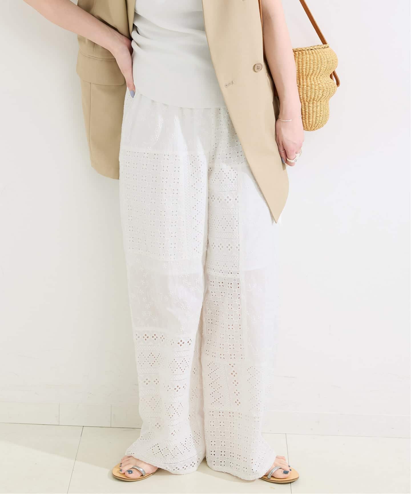 同色刺繍ながら、パッチワーク風に剥いだ奥行きのあるコットンレースがぐっとこなれた印象を与えます。