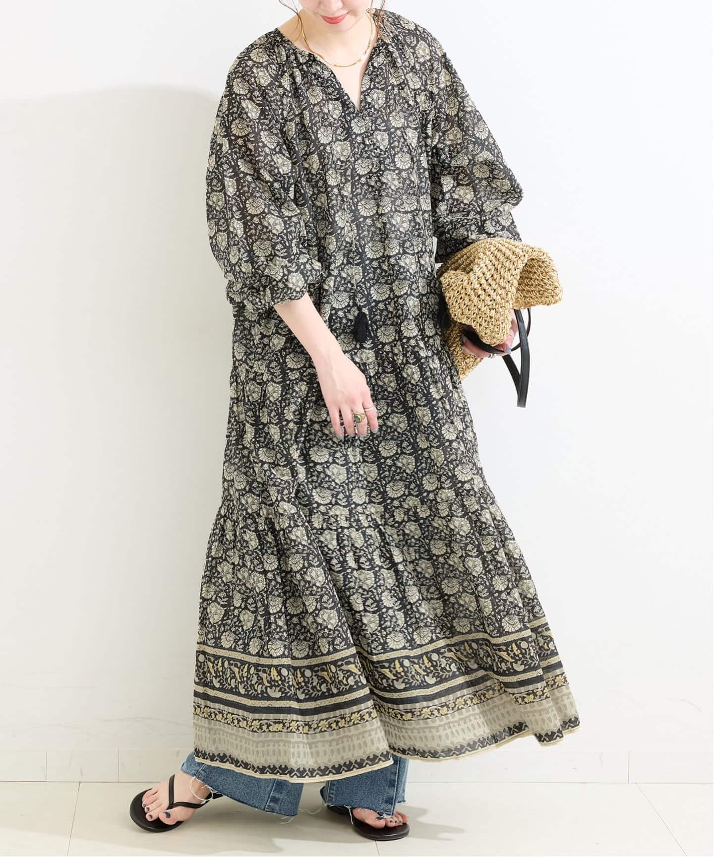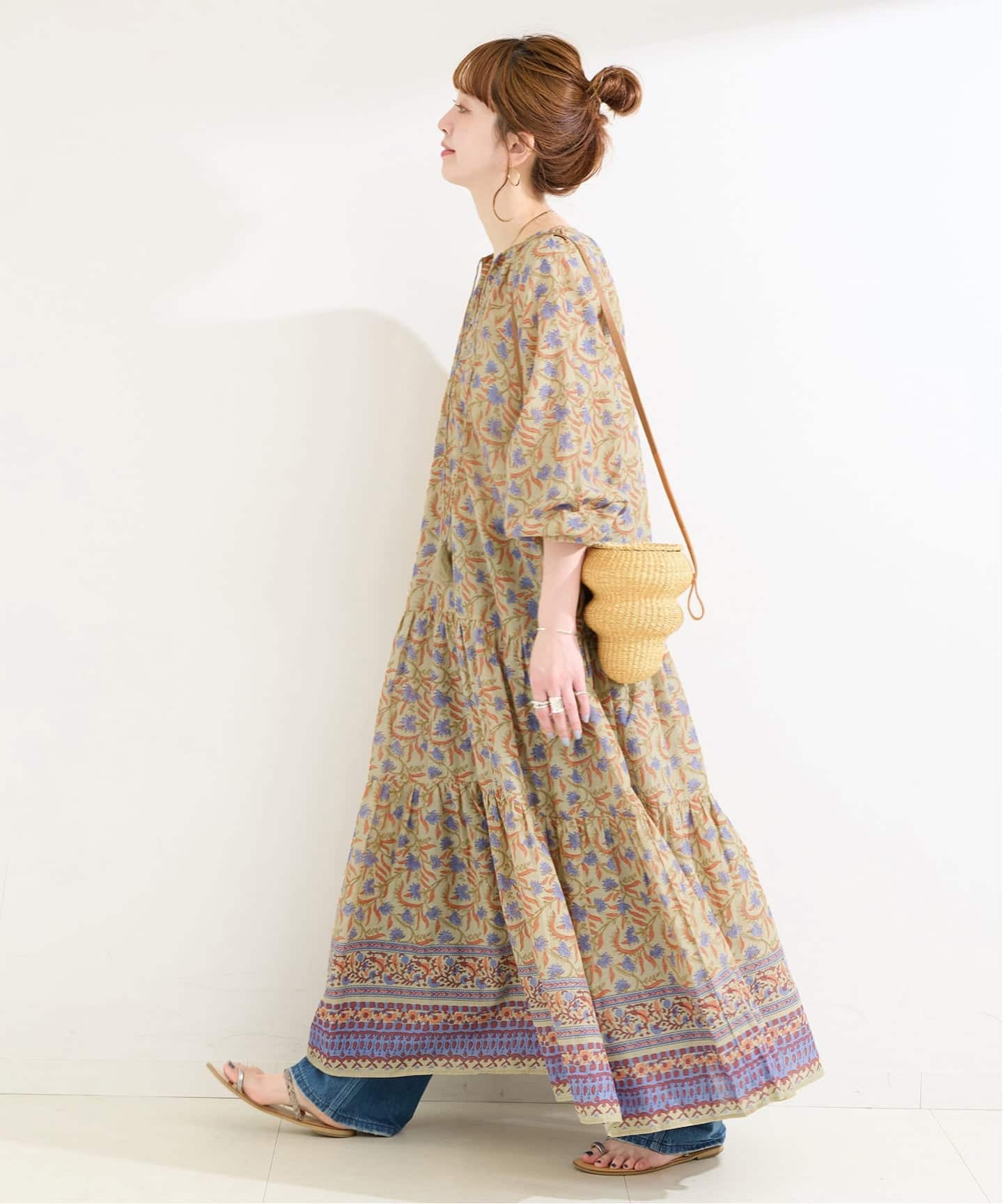 多種多様な柄を掛け合わせた雰囲気のある花柄ワンピース。