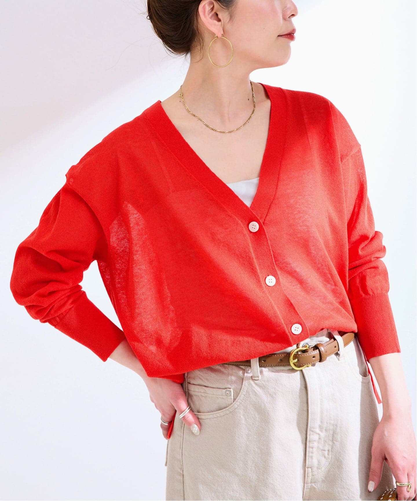 カラーが映えるドライタッチで涼しげなリネン混シアーカーディガン。