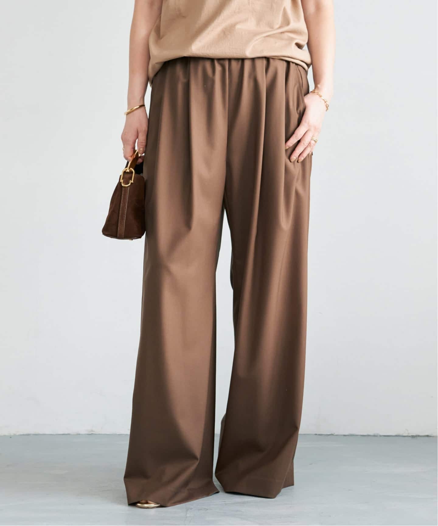 ウエストはゴム使用ながらタックをしっかり取り、縦に落ちるラインをKEEP。