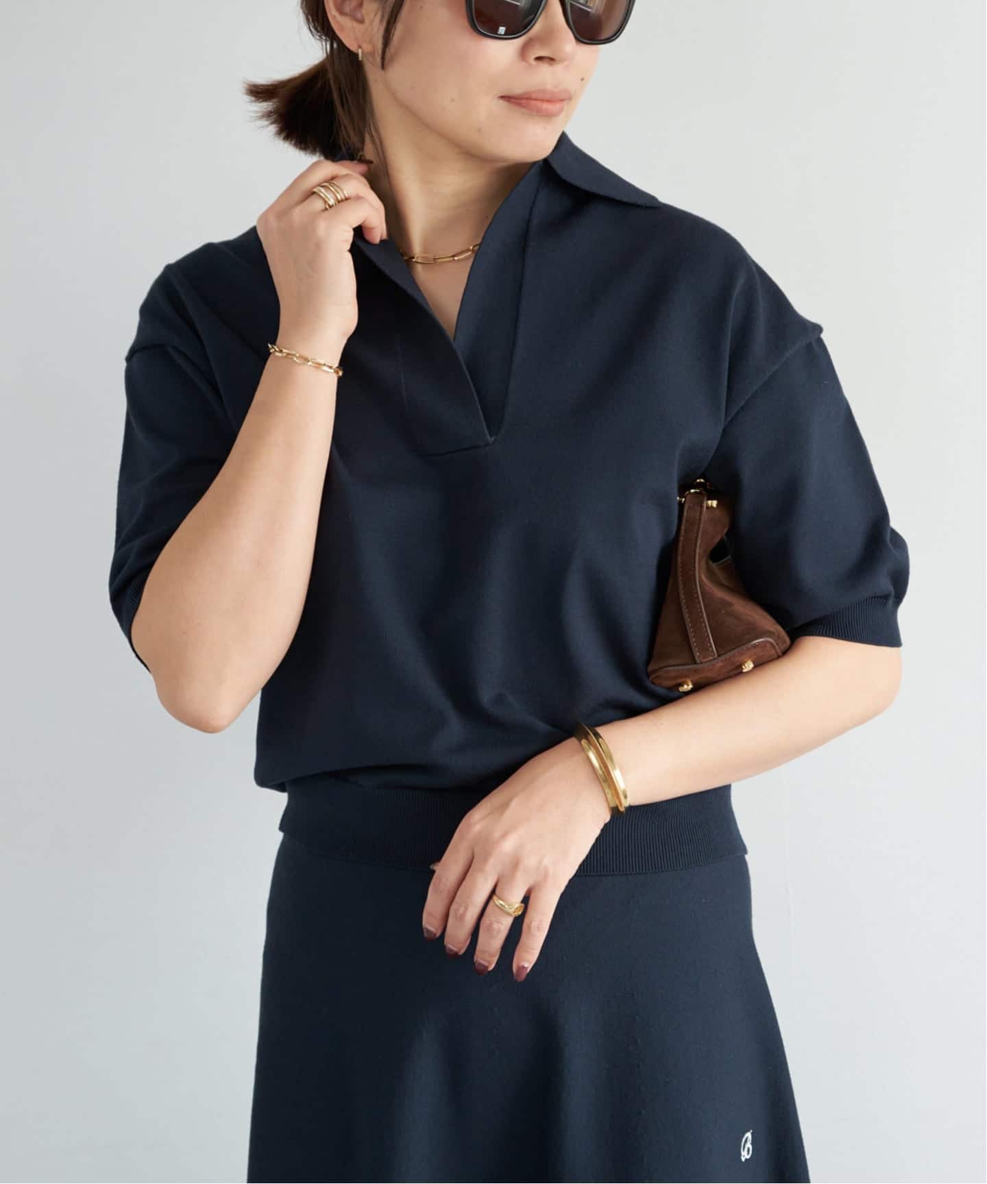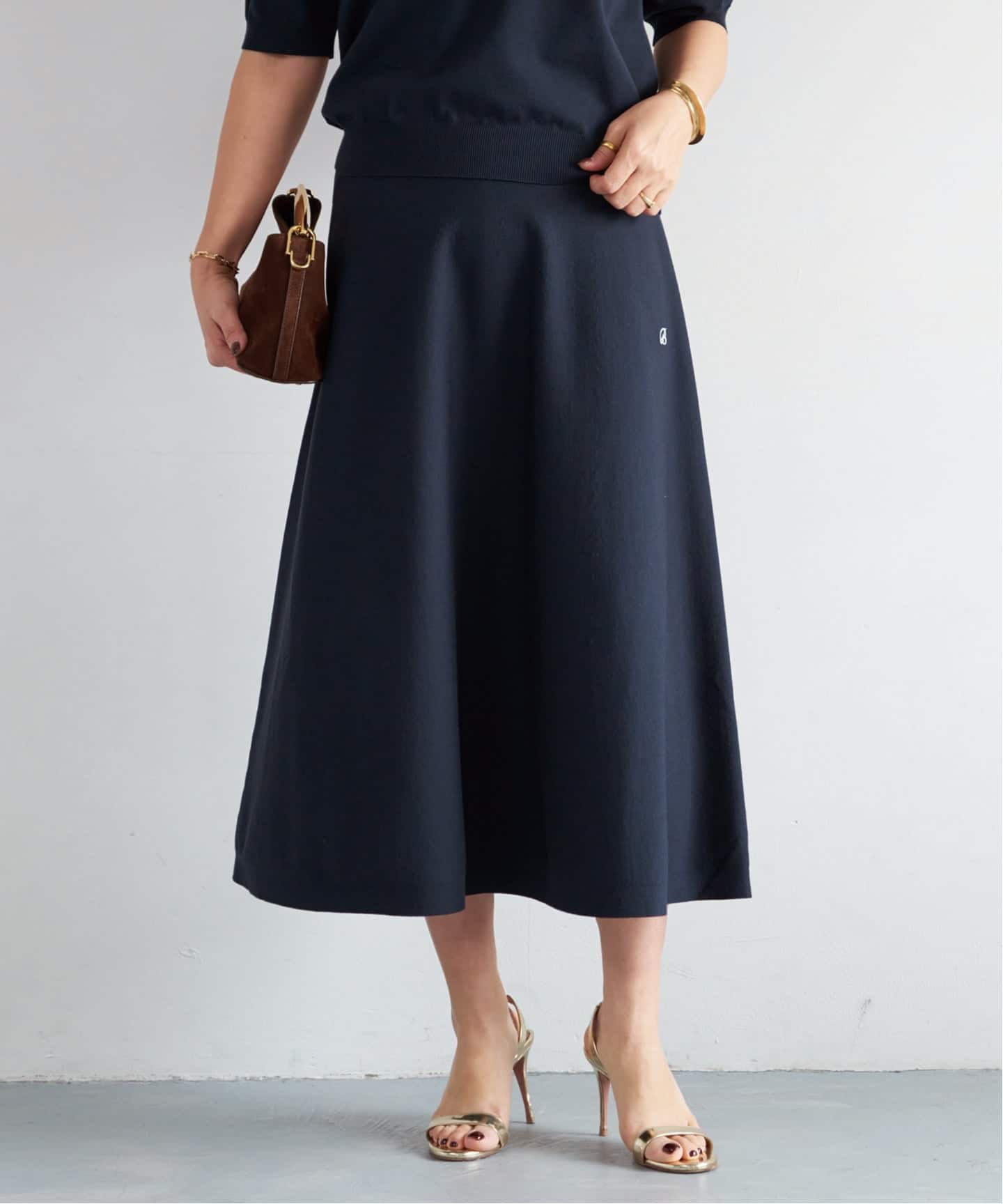 衿付きのスキッパーニットにミモレ丈のフレアスカートはブランド定番の高品質な素材を使用。