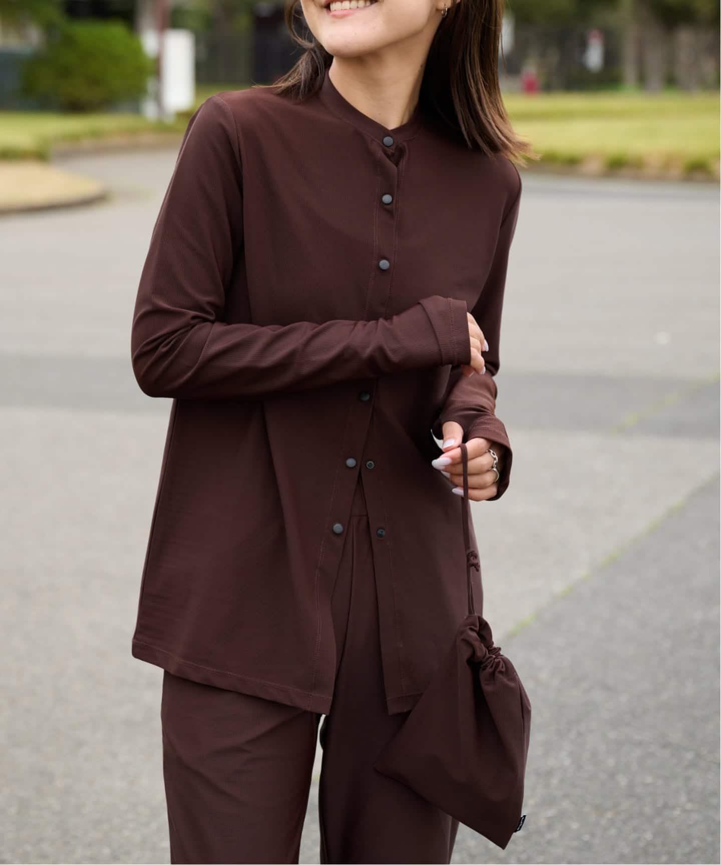 日よけ対策を兼ねあえて長袖にし、袖はウエストで腰巻にしたり汎用性のあるデザインにしています。