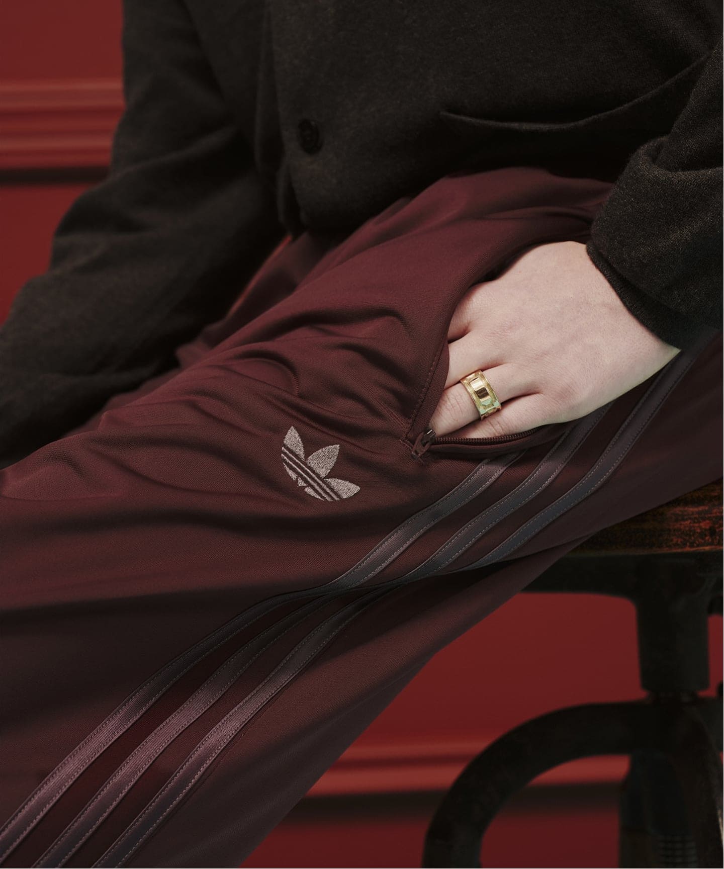 FIREBIRDのトラックパンツを、深みのあるバーガンディで別注。