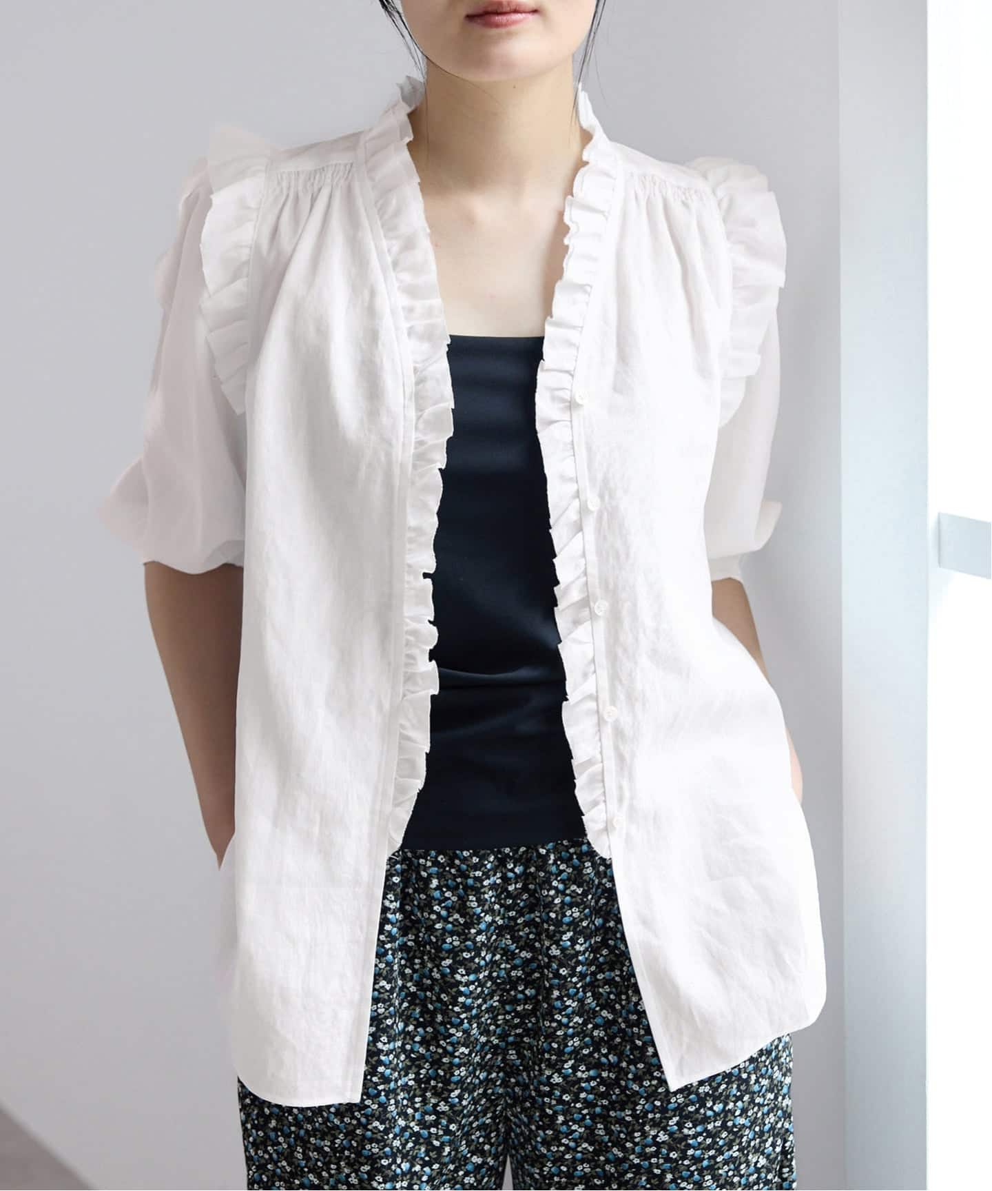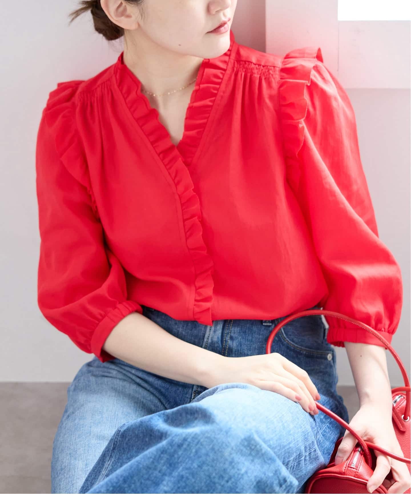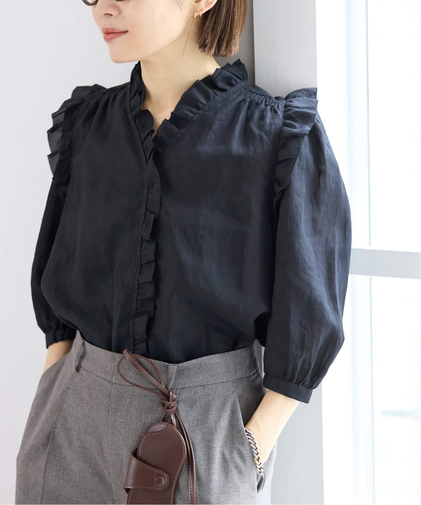ドライな質感とほどよいシアー感のある素材に、裁ち切りフリルや深めのVネックが映える、大人っぽく着られるデザインです。