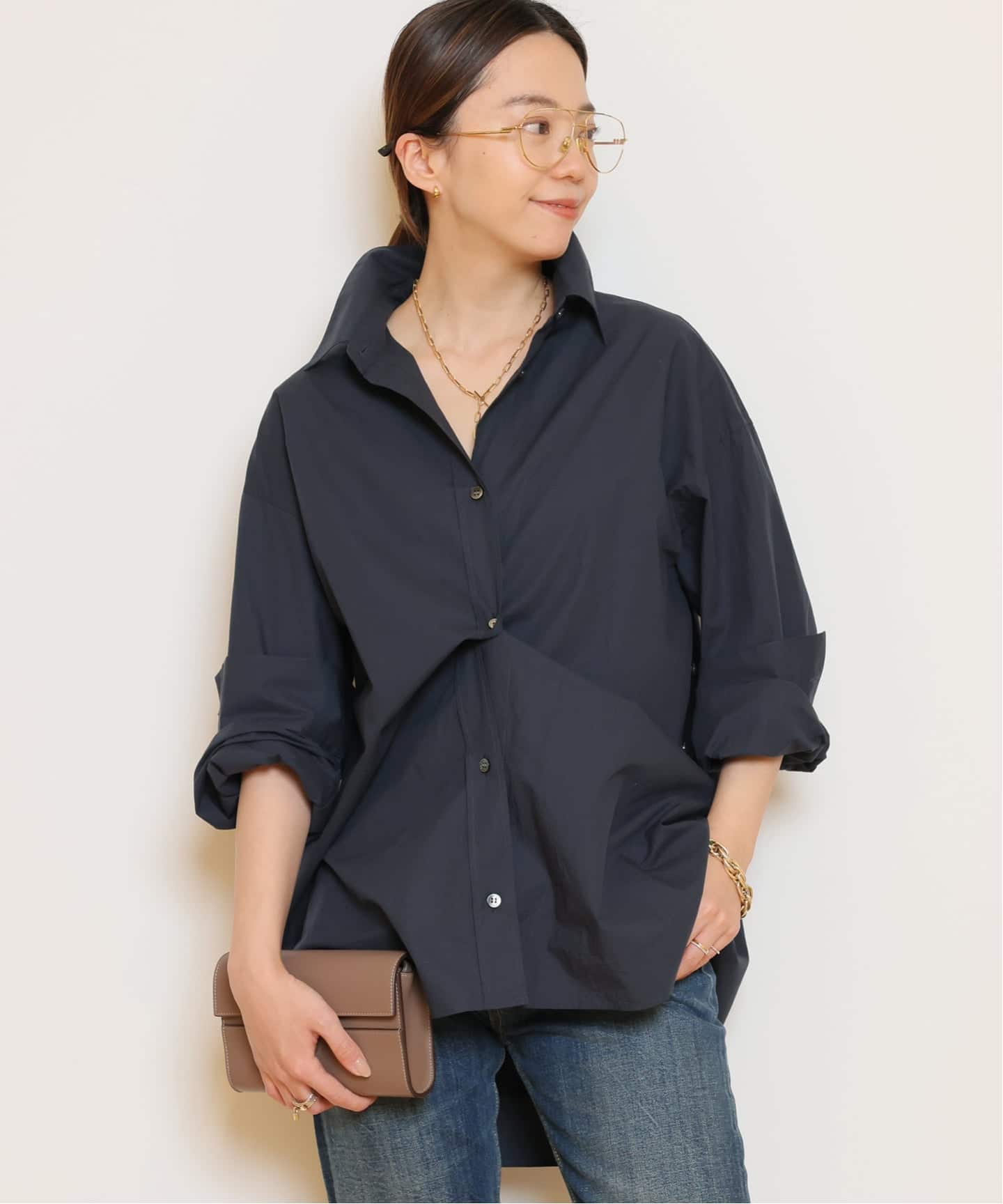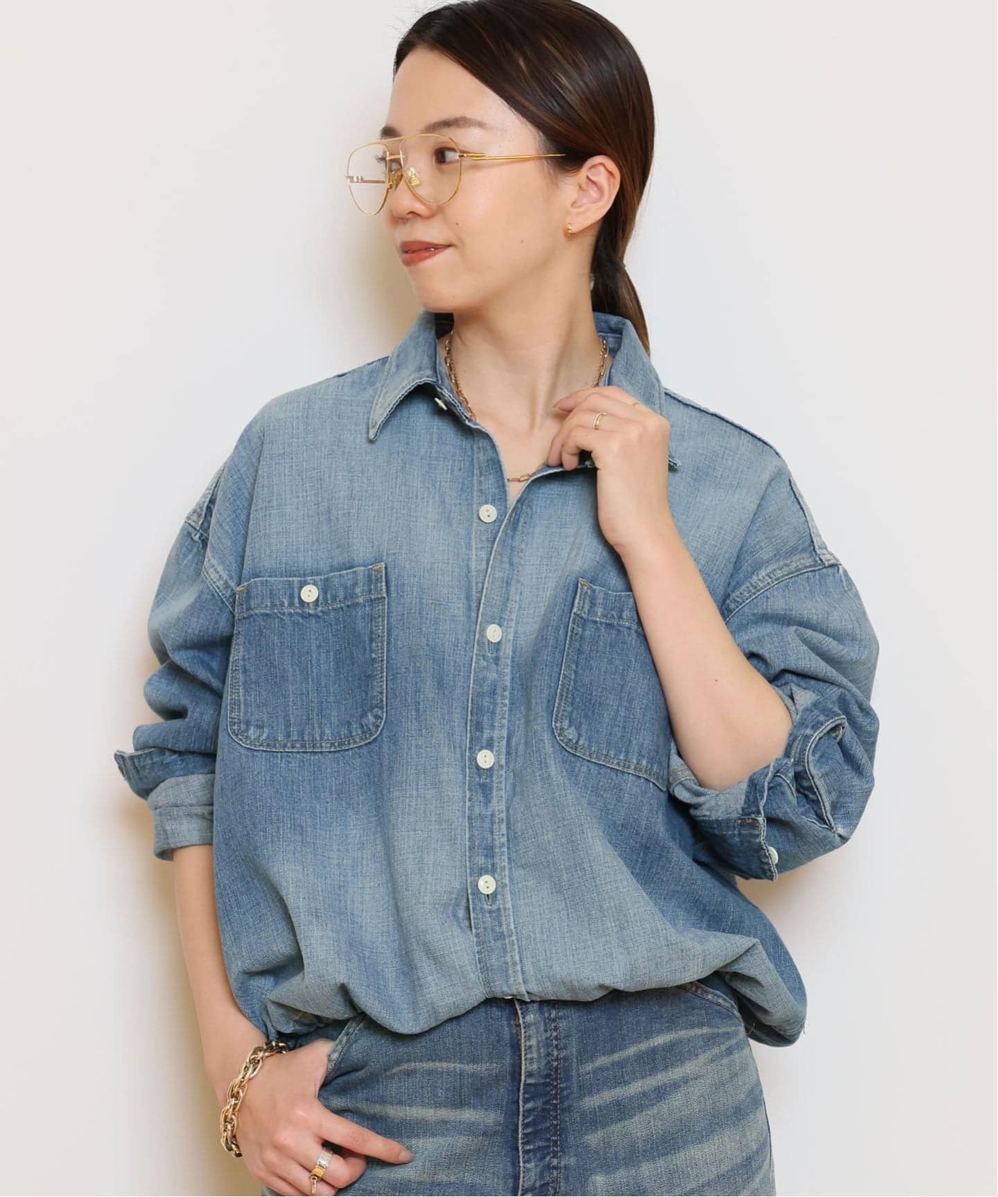 バルーンシルエットのデニムシャツが新鮮。ウエストをきゅっと細く見せてくれるのも嬉しいポイントです!