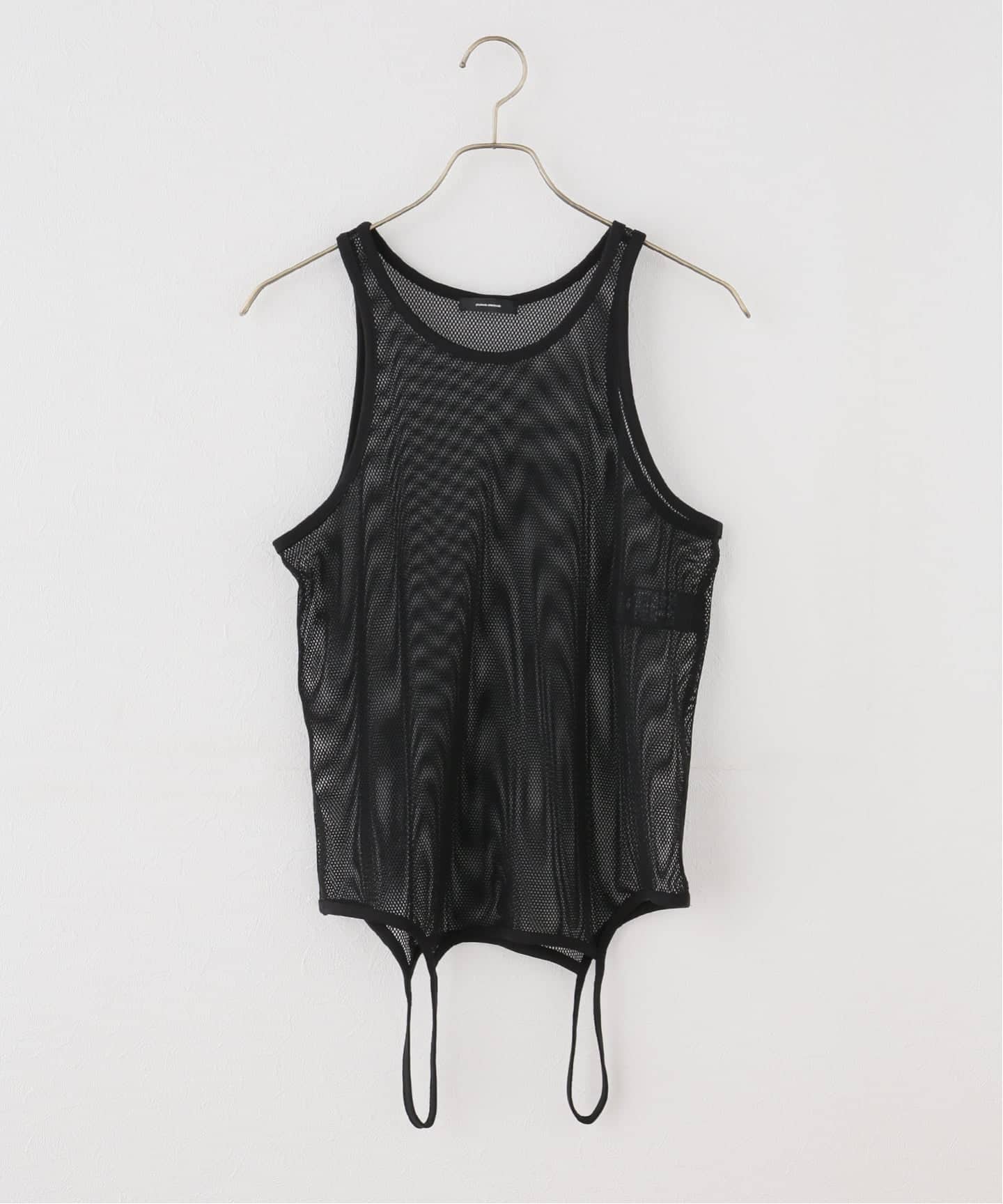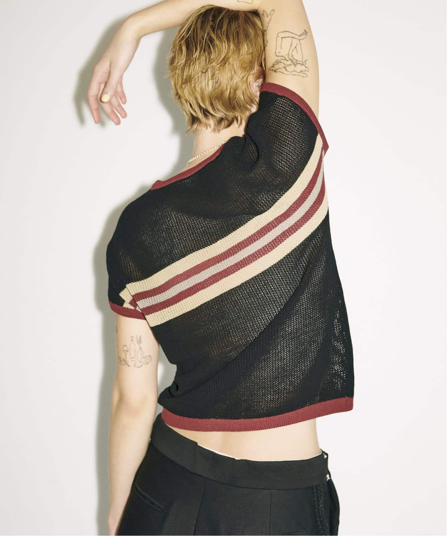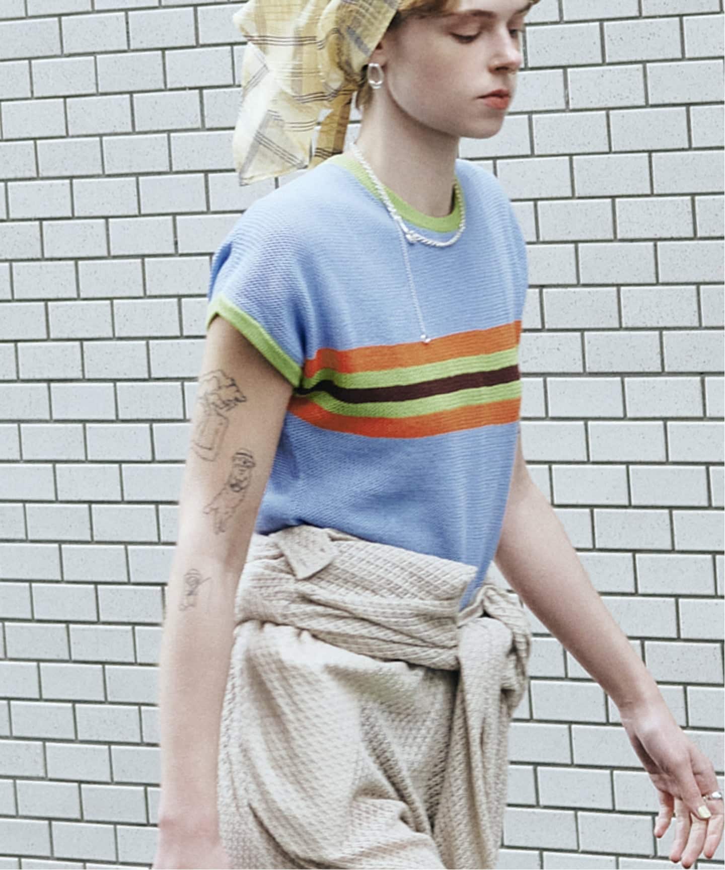 ニットメッシュTシャツを主役に、グリーンのカットソーをウエスト巻きでカラーをリンクさせ、まとまりをプラス!