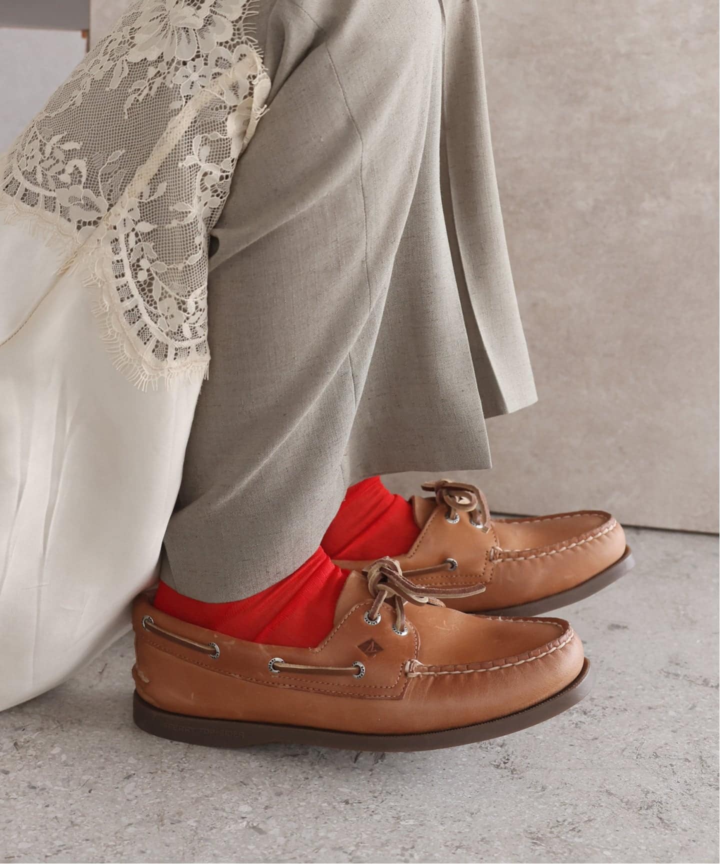 足元をベージュのデッキシューズでまとめたのがポイントです。