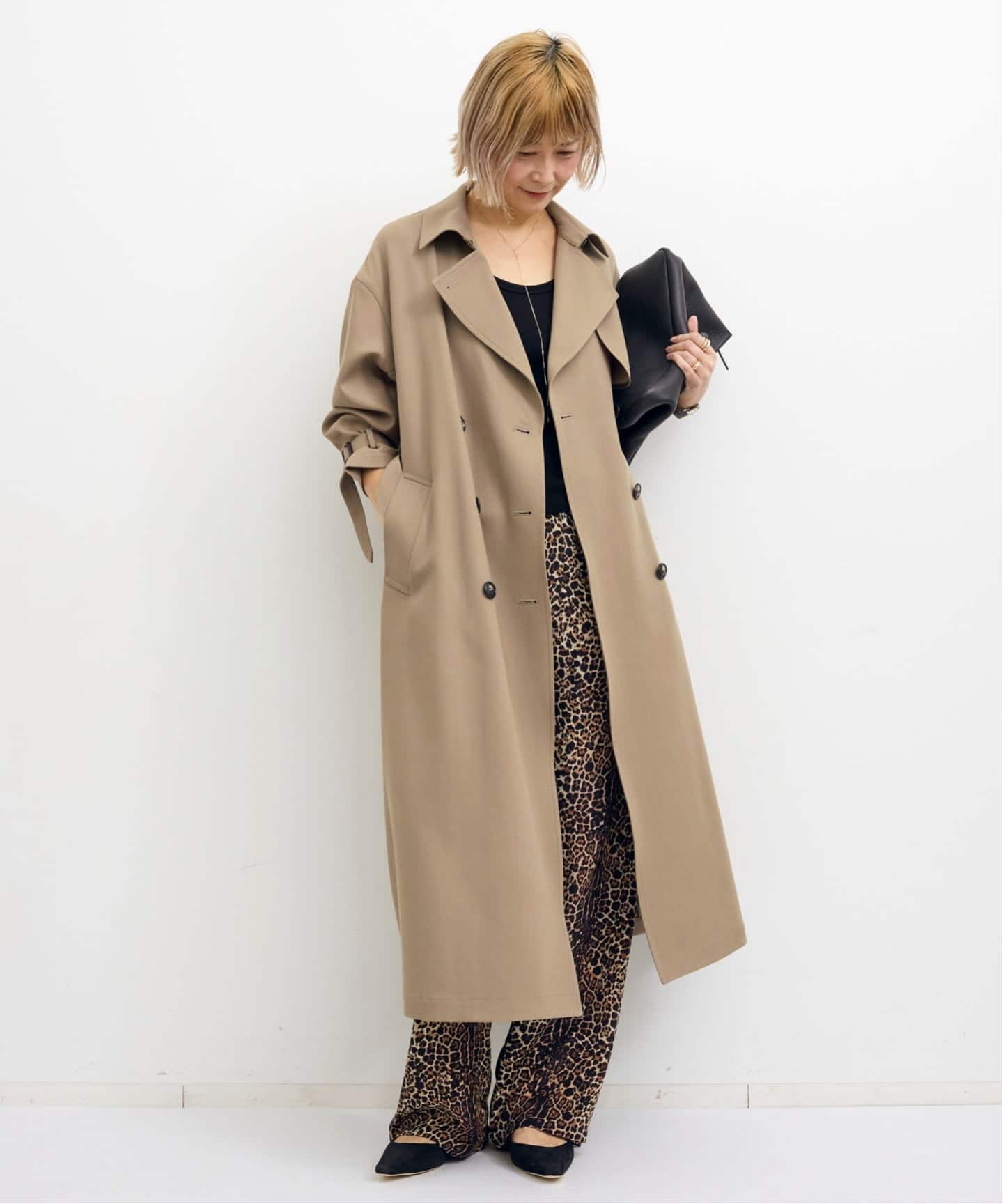 上品なベージュはアパルトモンの別注カラー。釦やバックルをダークトーンでまとめ洗練された雰囲気に。