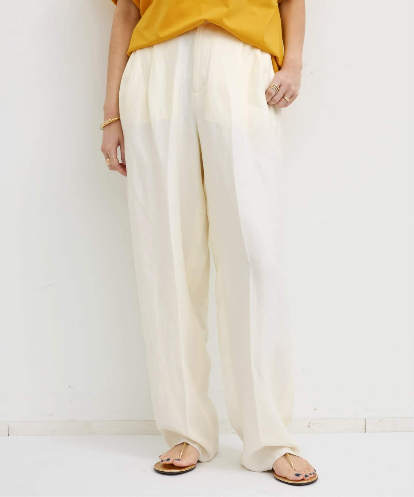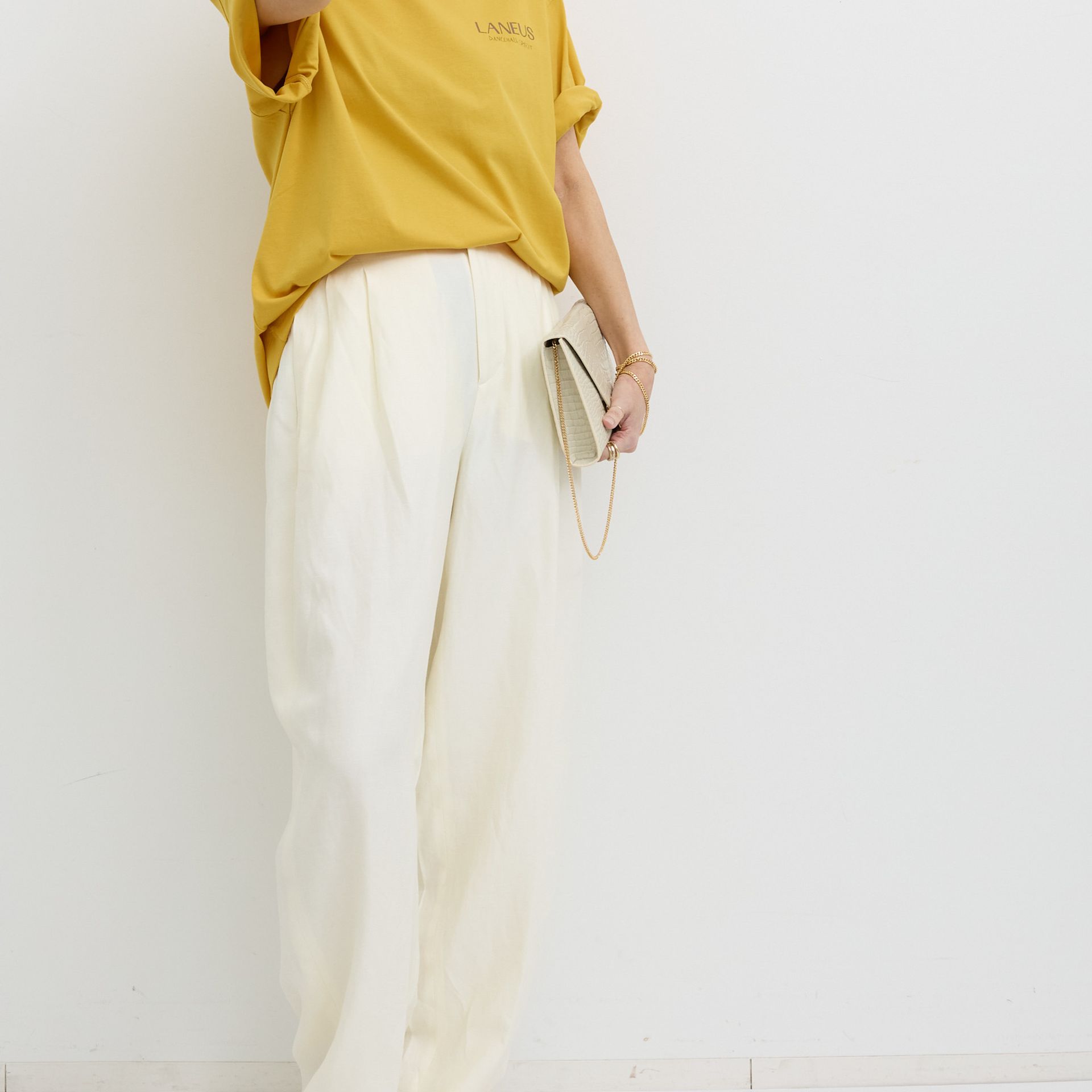 メンズのコレクションからセレクトしたTシャツはゆったりとしたオーバーシルエット。センタープレスの効いたリュクス感のあるパンツで大人の余裕を感じるスタイリングに。