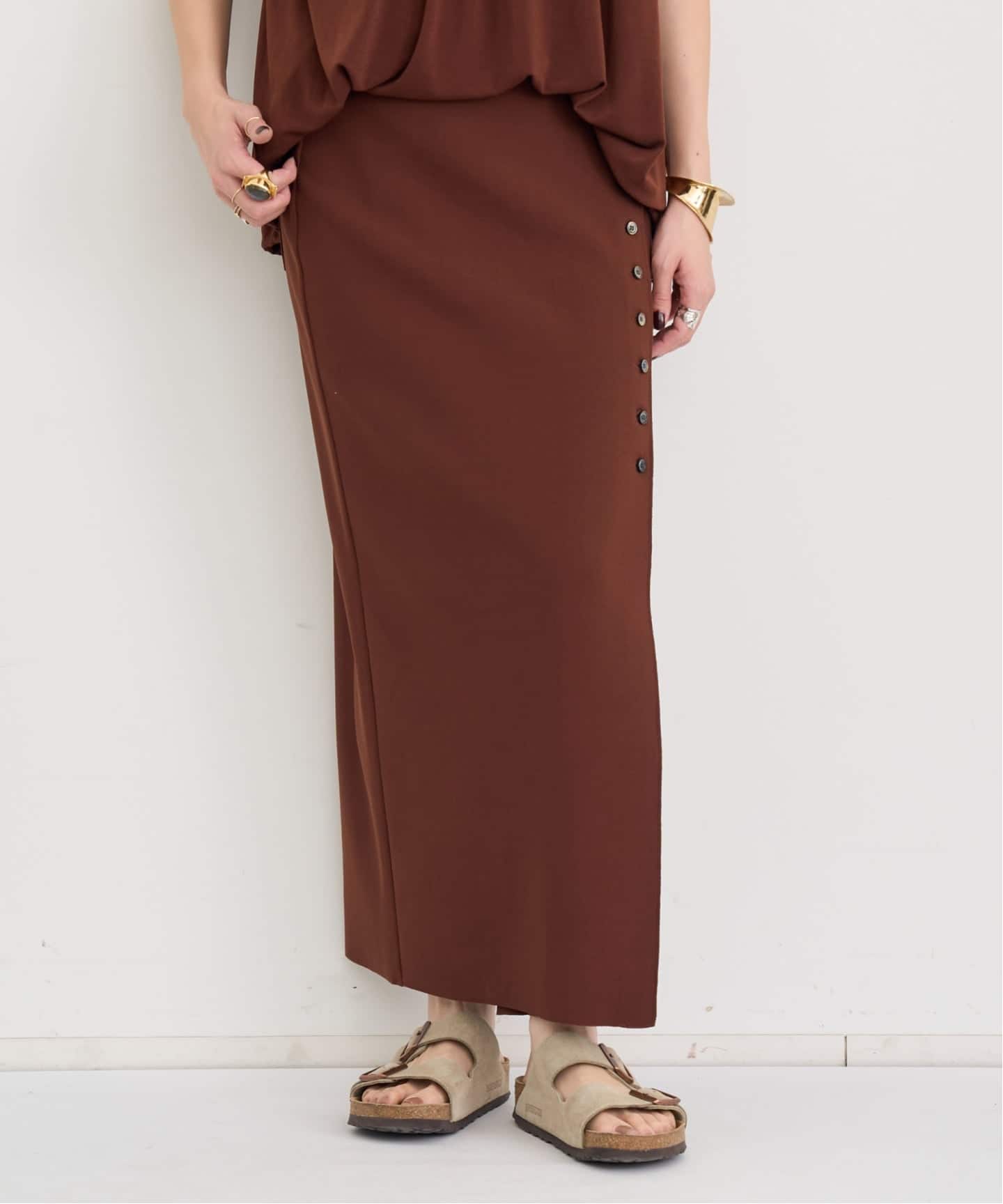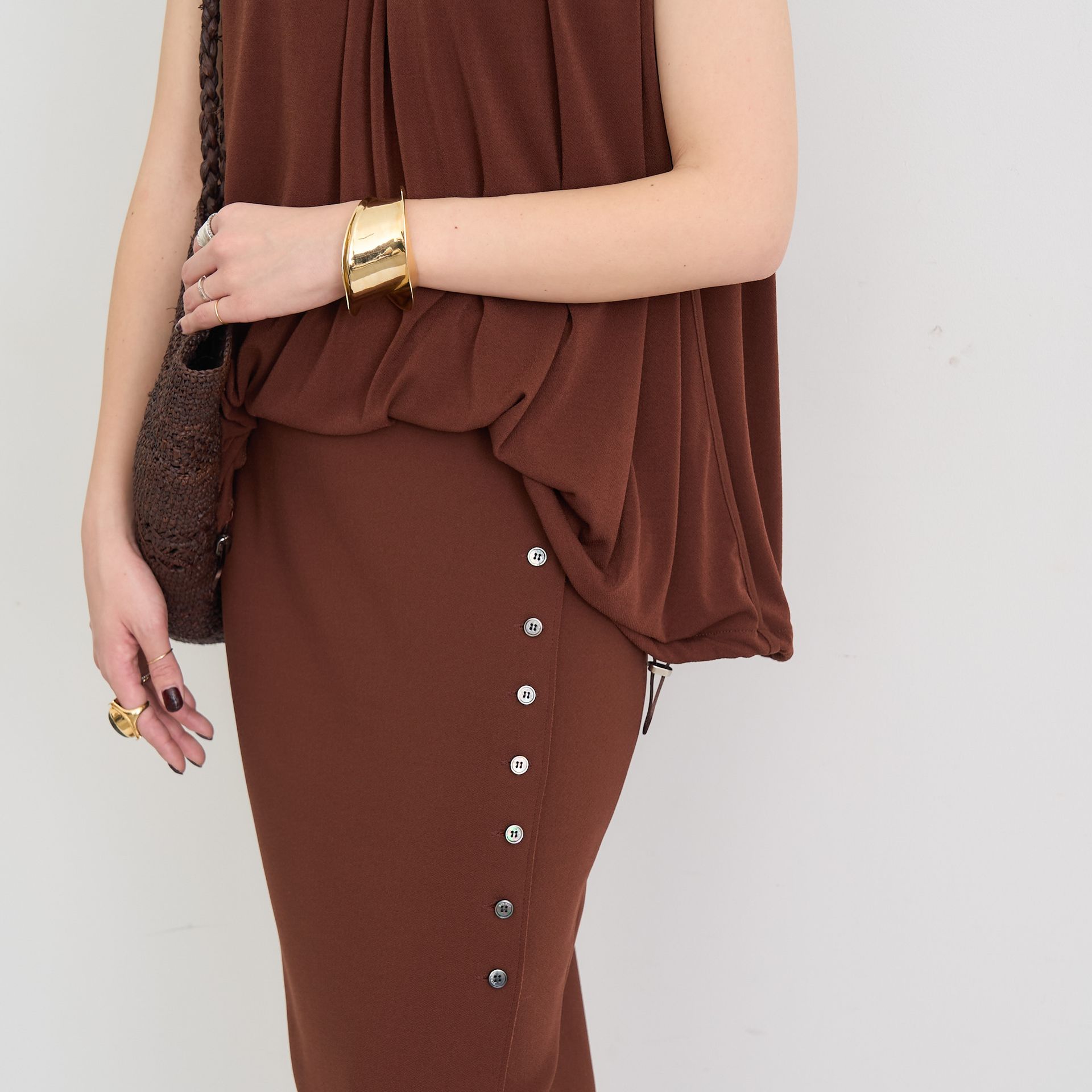 サイドについた釦でウエストを絞ってニュアンスのあるシルエットにするのがおすすめ。