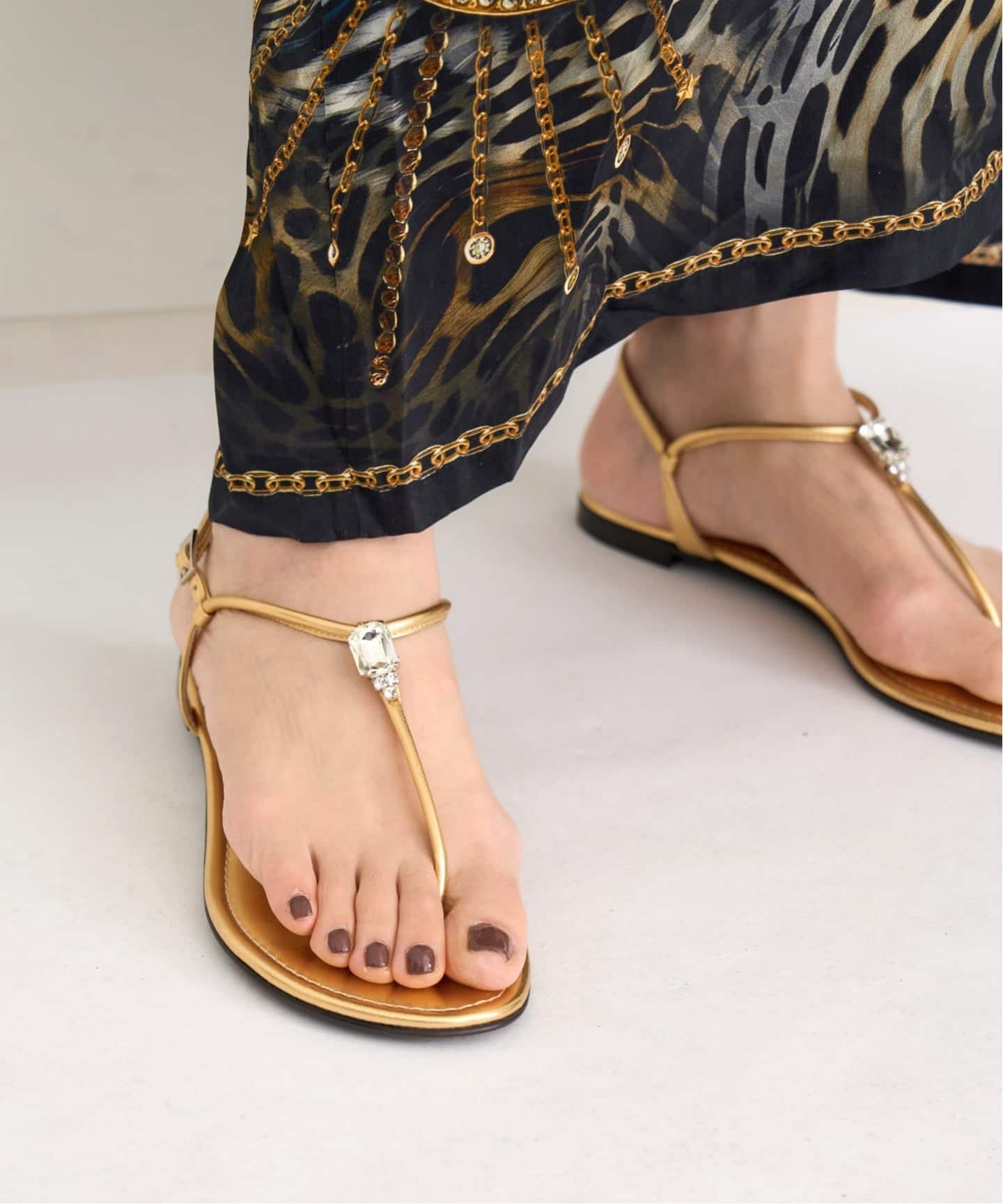 フラットながら美しくエレガントな足元が叶う靴“GIUSEPPE ZANOTTI”。ジュエリーをつけたかの様なビジューのサンダルは夏のカジュアルなスタイルに艶を与えてくれる。