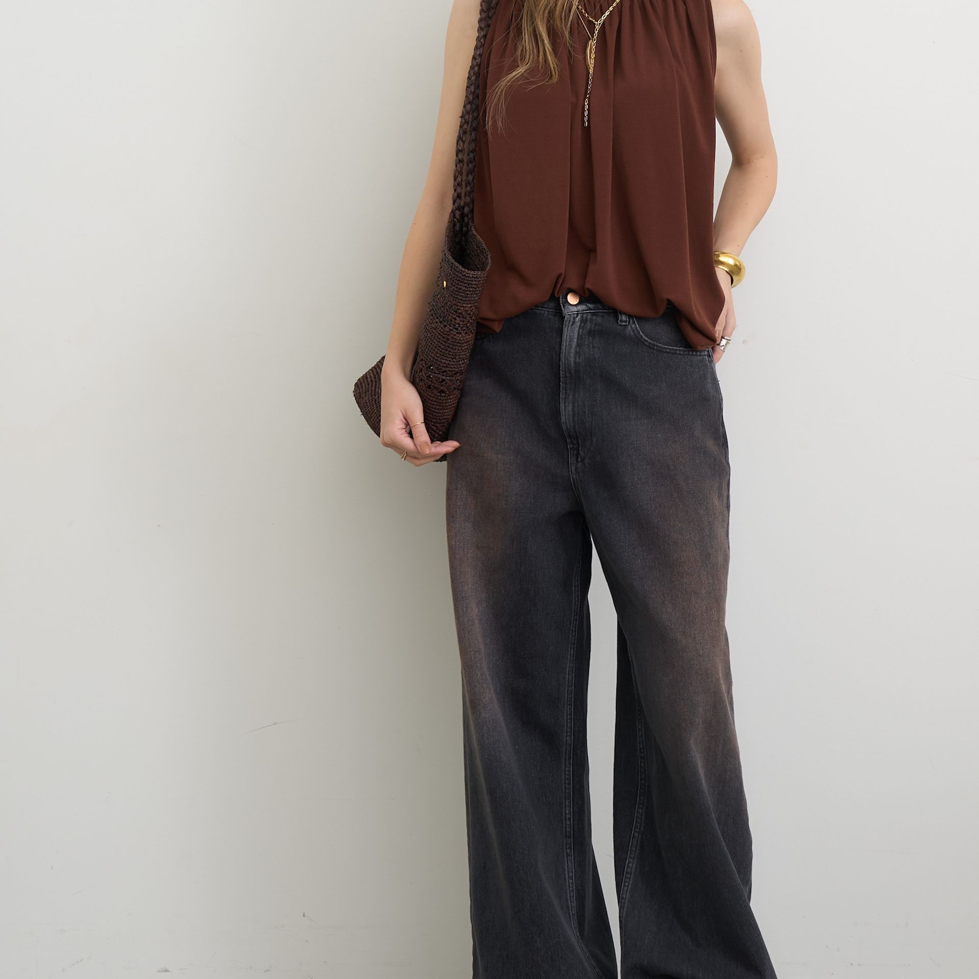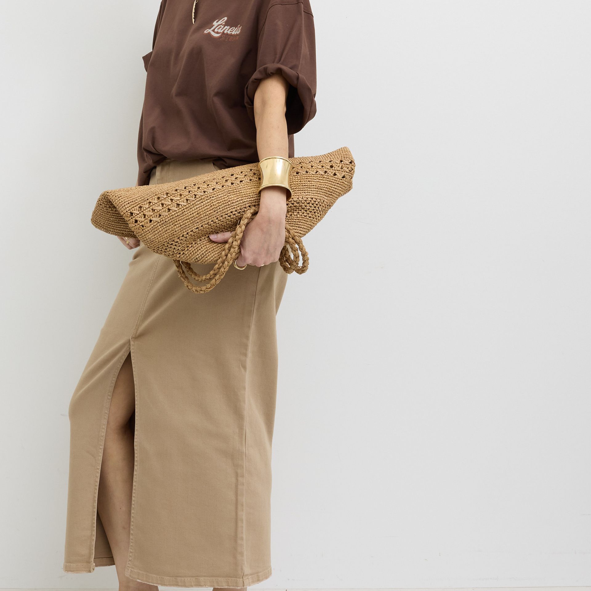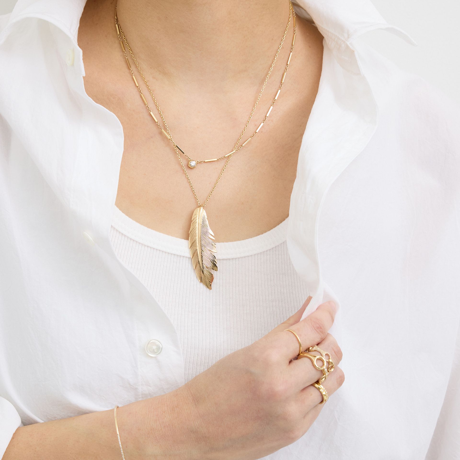 赤土のようなブラウンが女性らしさを演出してくれる。こんな風にネックレスの重ね付けも楽しみたい。