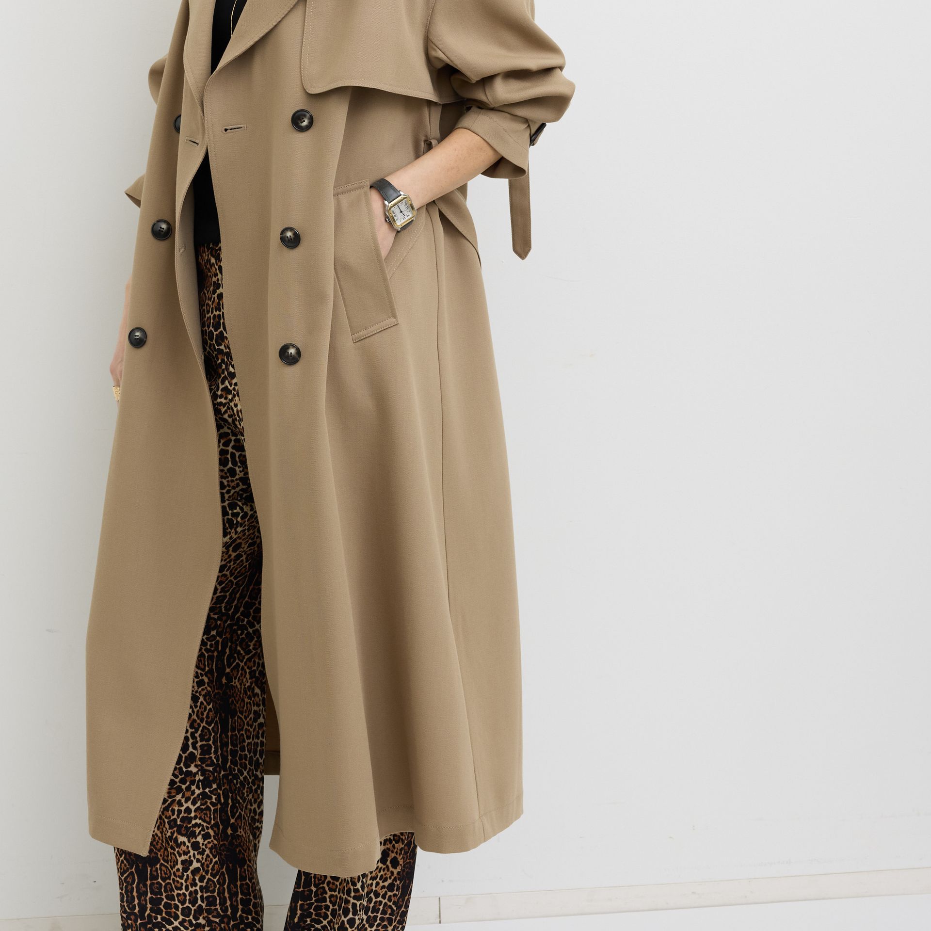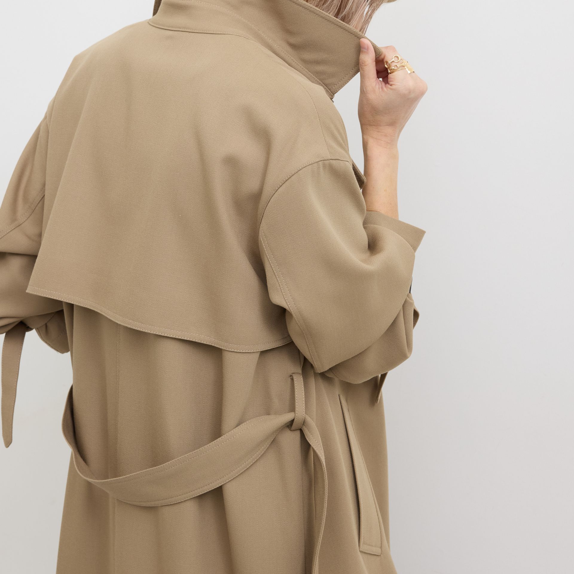 ウールの強撚糸を使用した生地は程よい落ち感があり、コットン素材のトレンチとは違い女性らしさを感じる佇まい。袖を通すと分かるさらりとした快適な着心地も魅力です。