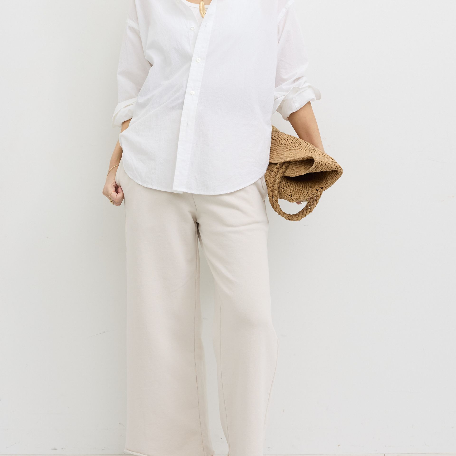 オールホワイトに羽織って決まりすぎない程よく肩の力が抜けたスタイルに。