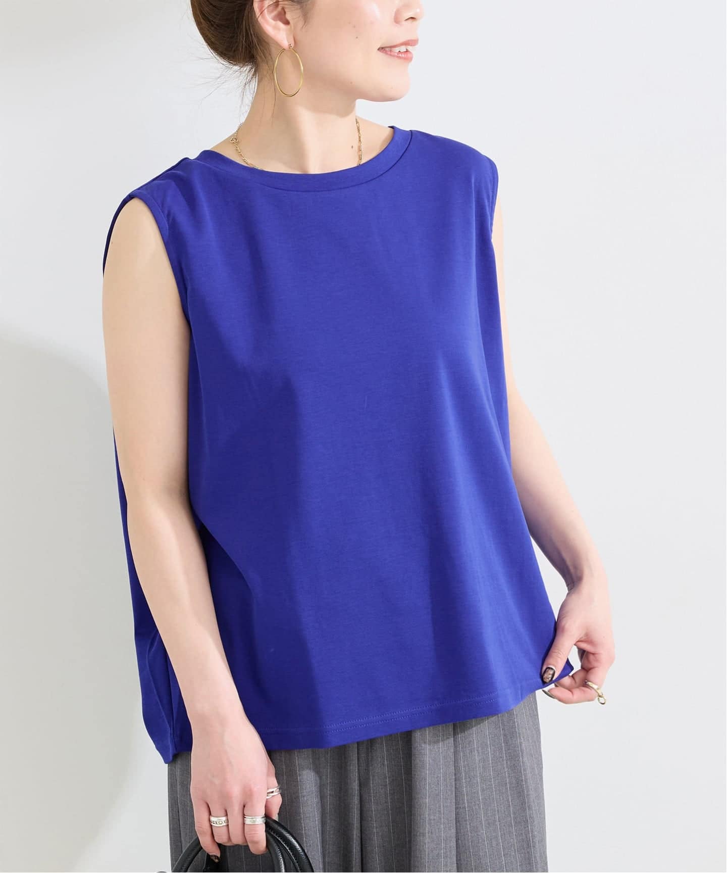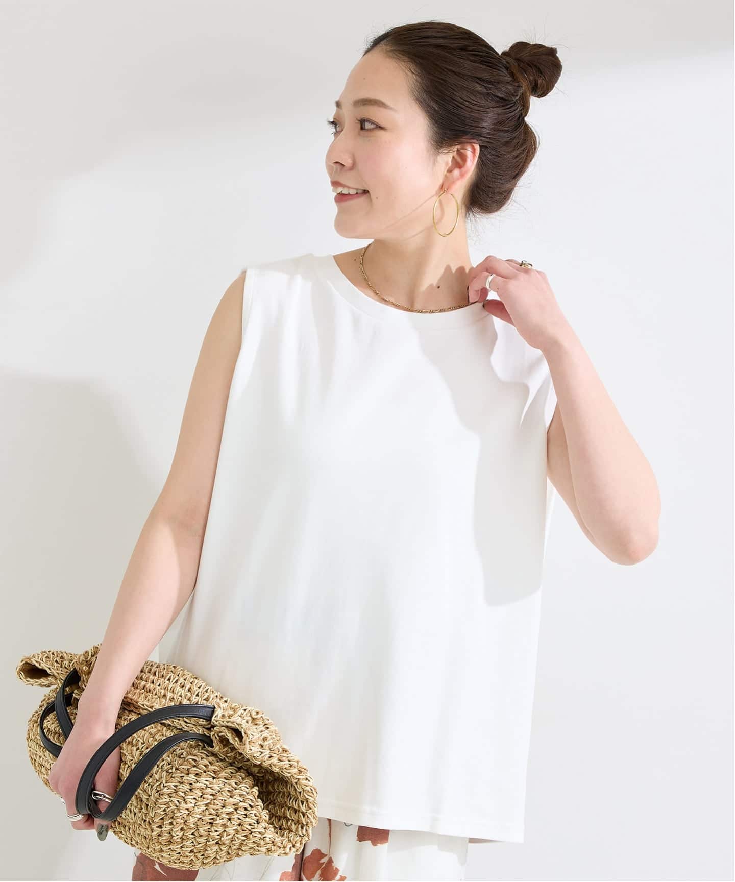 さらりとした肌触りのカットソー素材で後ろ肩の内側にタックをいれ、肩から落ちるようなボックス型にしてシルエットをだしています。ヒップにかかる着丈で、ウエストインもアウトも着やすい丈感になっています。